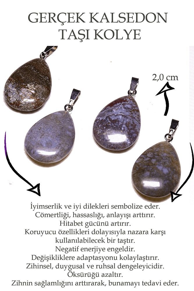Bu doğal taş kolye tasarımımızda; kalsedon akik Taşı kullanılmıştır. Zincir ölçüsü 45 cm\'dir. Her için uyumludur. Yetişkin ve çocuk için kullanılabilir. %100 Orijinal ve gerçek taştır. Sinirinizi stresinizi alacak, mineral açısından oldukça zengin olduğu için bulunduğu için teniniz ile temas eder etmez aradaki farkı kısa bir süre içinde hissedeceksiniz.