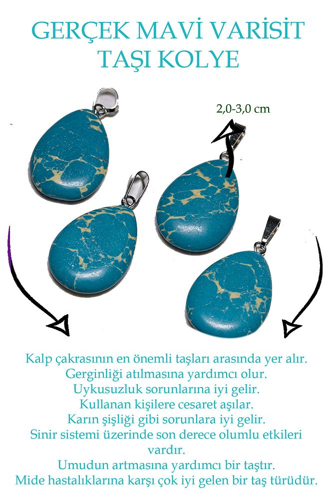 Bu doğal taş kolye tasarımımızda; Varisit taşı kullanılmıştır. Zincir ölçüsü 45 cm'dir. Her için uyumludur. Yetişkin ve çocuk için kullanılabilir. %100 Orijinal ve gerçek taştır. Sinirinizi stresinizi alacak, mineral açısından oldukça zengin olduğu için bulunduğu için teniniz ile temas eder etmez aradaki farkı kısa bir süre içinde hissedeceksiniz.