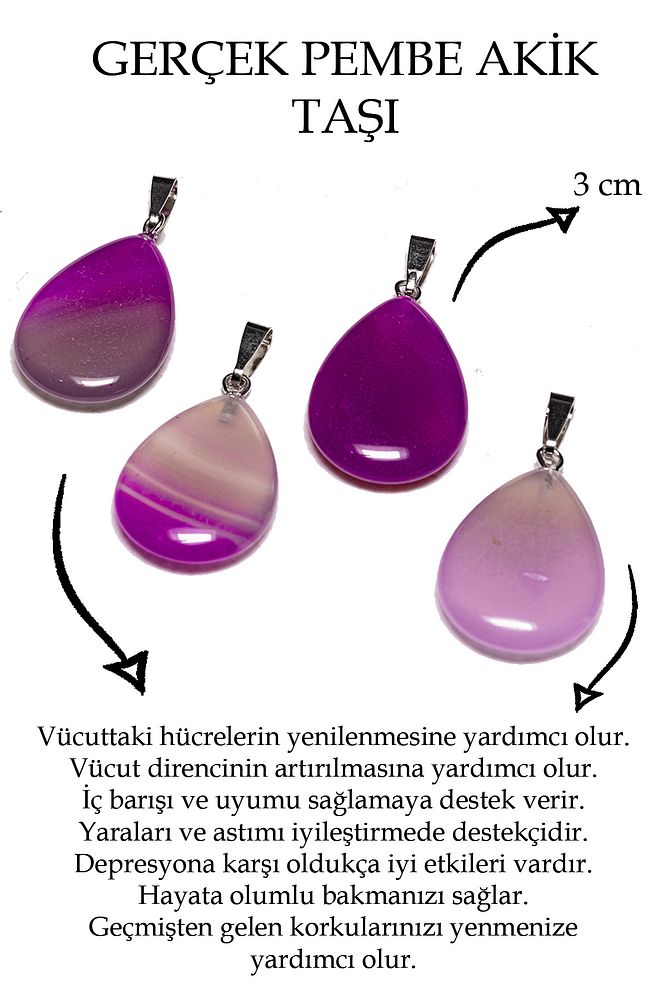 Bu doğal taş kolye tasarımımızda; Pembe akik taşı kullanılmıştır. Zincir ölçüsü 45 cm'dir. Her için uyumludur. Yetişkin ve çocuk için kullanılabilir. %100 Orijinal ve gerçek taştır. Sinirinizi stresinizi alacak, mineral açısından oldukça zengin olduğu için bulunduğu için teniniz ile temas eder etmez aradaki farkı kısa bir süre içinde hissedeceksiniz.