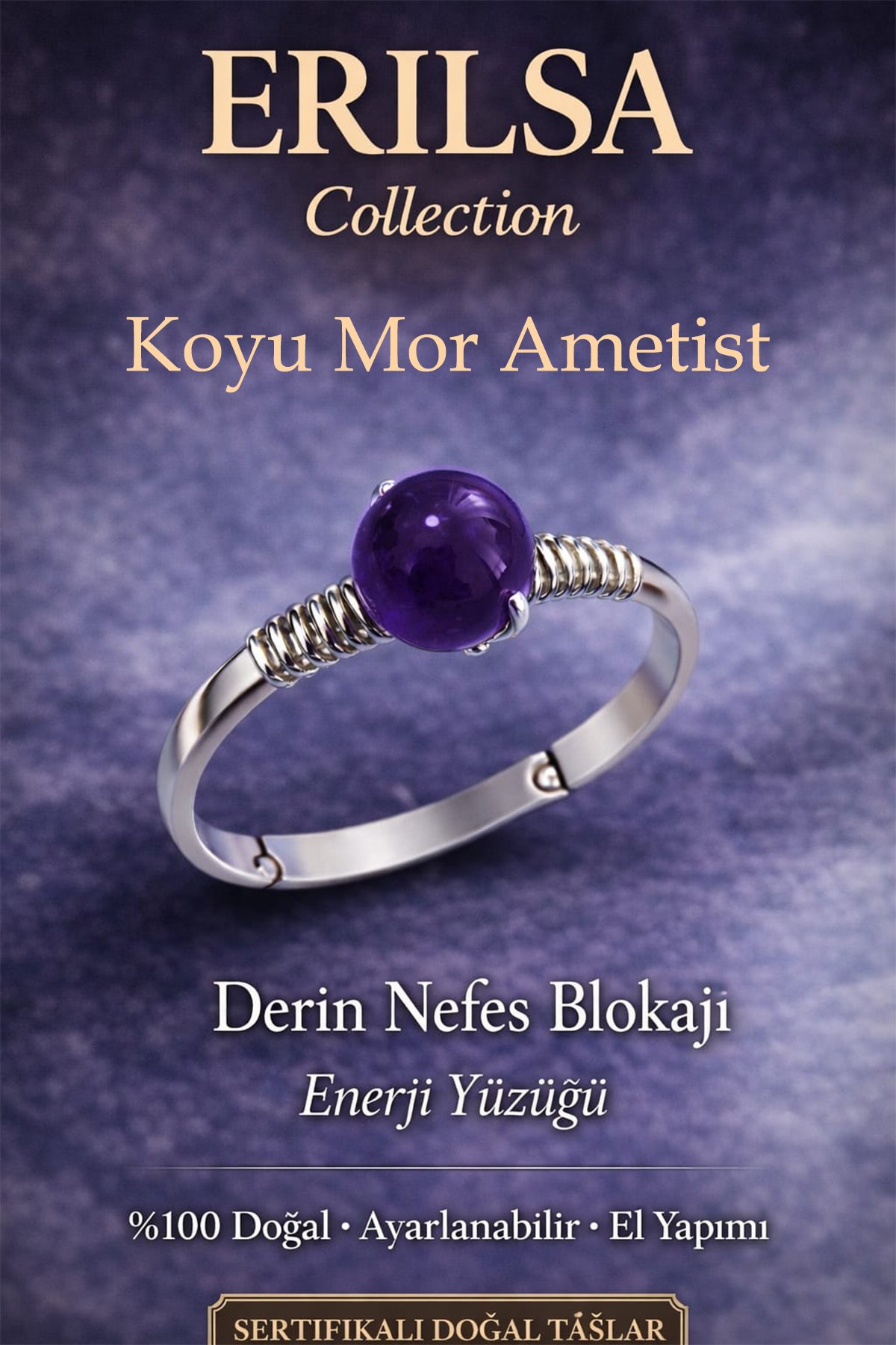 Koyu mor ametist taşı, sakinleştirici ve dengeleyici enerjisiyle bilinir. Derin nefes alamama hissi çoğu zaman zihinsel ve duygusal blokajlardan kaynaklanır. Bu yüzükte kullanılan doğal koyu mor ametist taşı, zihinsel gevşeme ve nefes enerjisinin rahatlamasına destek olur. Bakır bazlı seri altın kaplama, taşın doğal frekansını güçlendirerek vücutta daha dengeli bir his oluşturur. Ayarlanabilir ince kasa yapısı estetik ve konforu bir arada sunar. Düzenli kullanımda sakinlik, derin nefes alma hissi ve içsel huzur desteklenir. Balık, Kova ve Yengeç burçlarıyla uyumludur. El yapımı ve sertifikalı doğal taş ürünüdür.