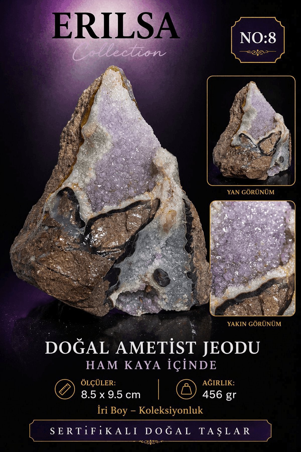 Ametist jeodu formundaki bu doğal taş kütle, açık mor tonları ve kristal yapısı ile estetik açıdan farklı bir görünüme sahiptir