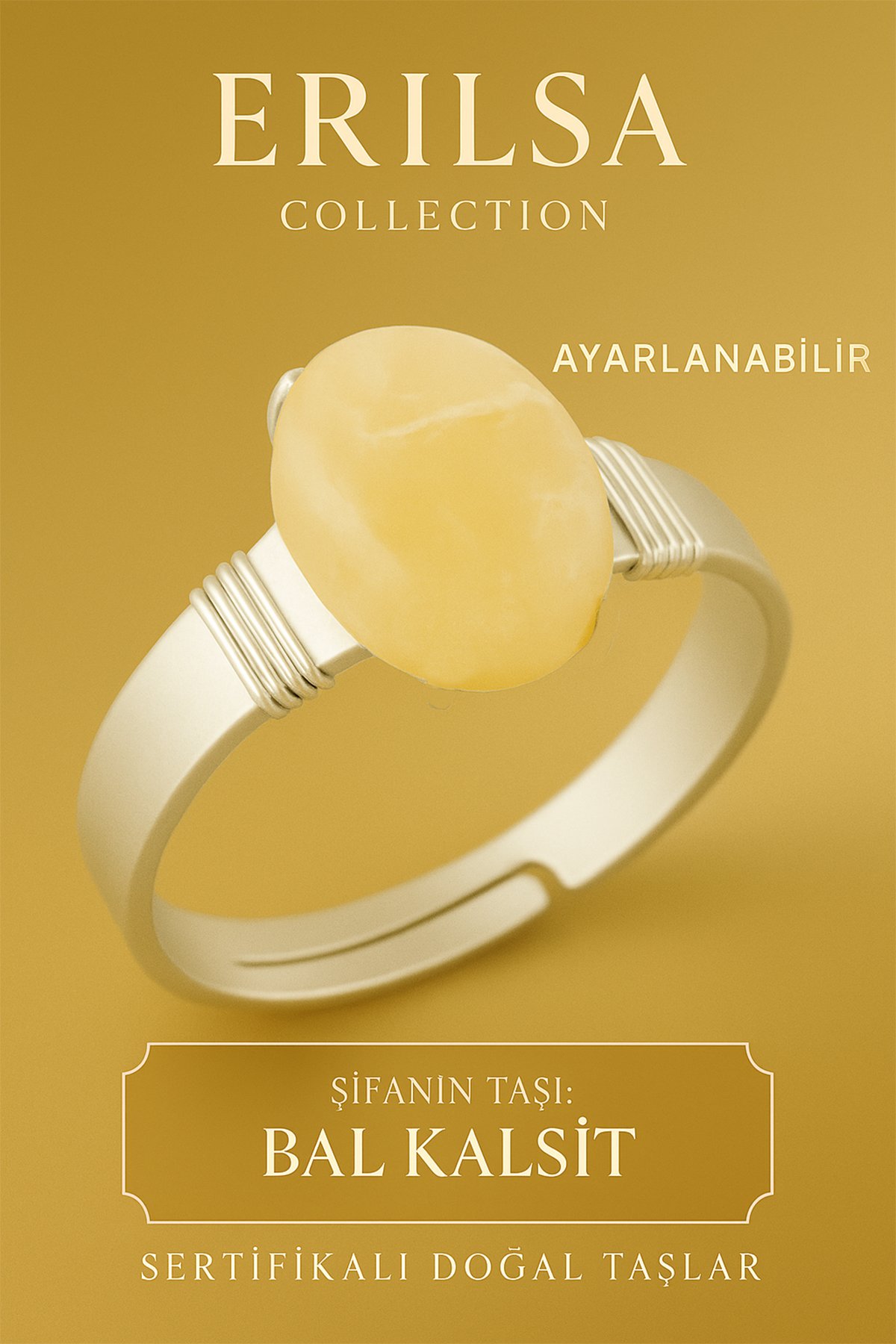 Sertifikalı Doğal Bal Kalsit Taşı Yüzük, zarif tasarımıyla şıklığı ve doğallığı bir araya getirir. Kalın tımbıl kasa yapısı sayesinde uzun ömürlü ve sağlamdır. Ayarlanabilir özelliği ile her parmağa uyum sağlar.