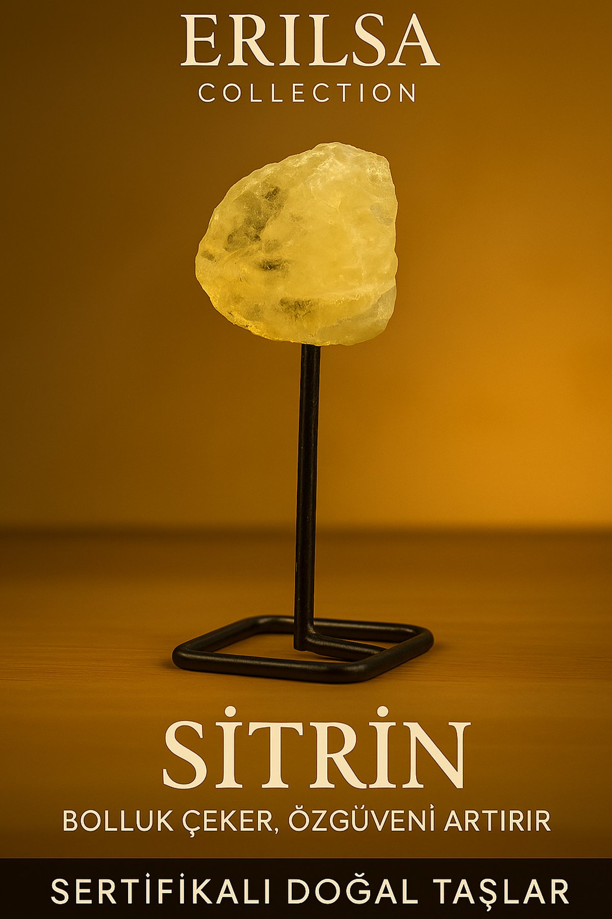 Altın sarısı tonlarıyla ışıldayan Sitrin Taşı, bu özel objede ham ve doğal formuyla siyah metal stand üzerinde zarif bir enerji sunar. Bolluk, bereket ve kişisel başarı taşı olarak bilinen Sitrin; enerjisiyle bulunduğu ortama canlılık, neşe ve motivasyon kazandırır. Aynı zamanda negatif enerjileri uzaklaştıran nadir taşlardandır.