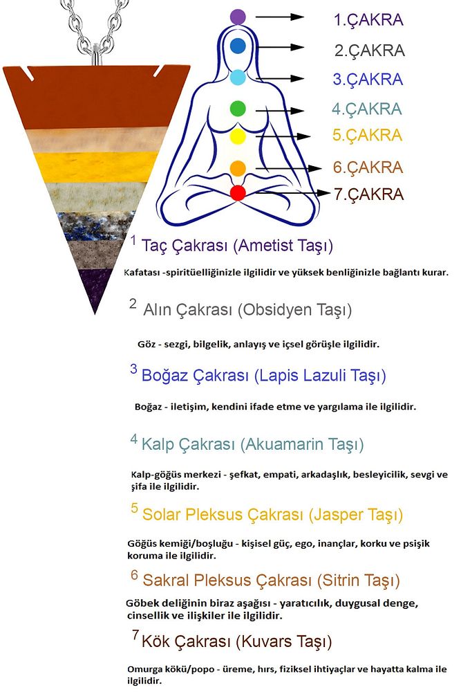 Bu doğal taş kolye tasarımımızda; Birinci kalite doğal Jasper Sitrin Kuvars Aventurin Lapis Lazuli Ametist Akik Taşı 7 çakra kullanılmıştır. Zincir ölçüsü 50 cm\'dir. Her bayan için uyumludur. Yetişkin ve çocuk için kullanılabilir. %100 Orijinal ve gerçek taştır. Sinirinizi stresinizi alacak, mineral açısından oldukça zengin olduğu için bulunduğu için teniniz ile temas eder etmez aradaki farkı kısa bir süre içinde hissedeceksiniz.