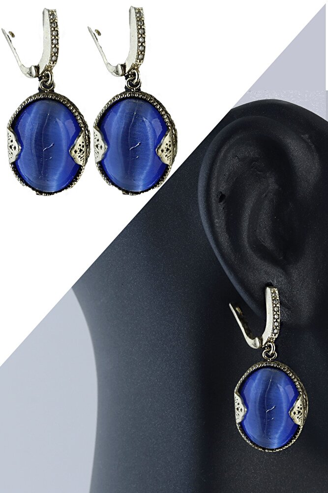 Sertifikalı Doğal Mavi Akik Taşlı Küpe