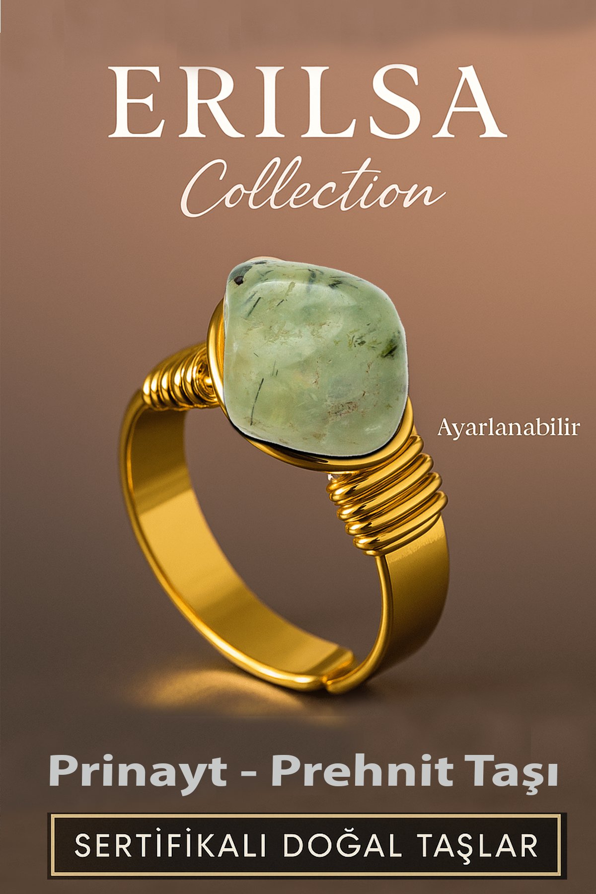 Erilsa Collection’ın özenle tasarladığı bu yüzük, %100 doğal ve sertifikalı Prehnit (Prinayt) taşı ile hazırlanmıştır.