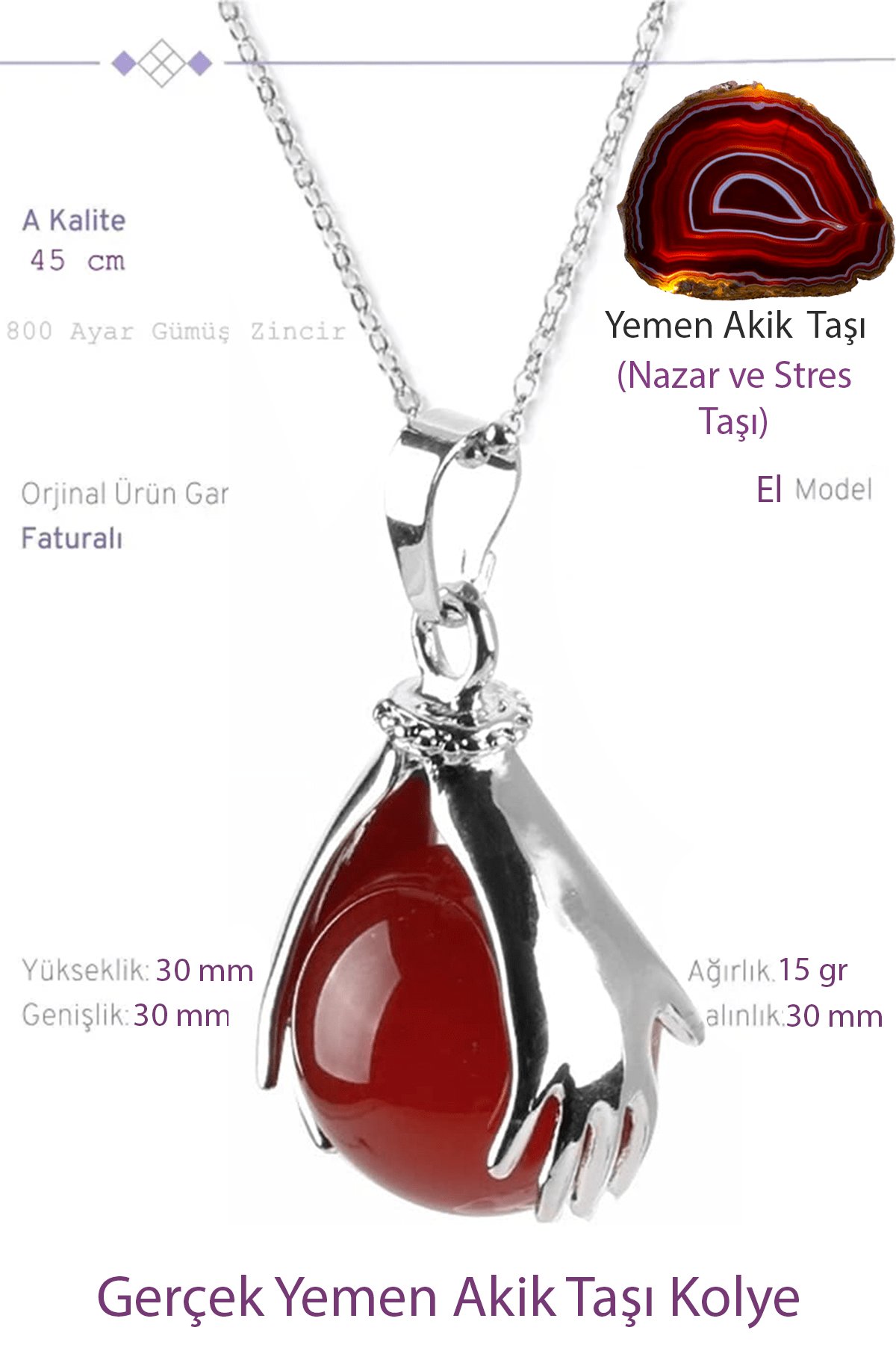 Sertifikalı El Pençe Model Gerçek Yemen Akik Taşı Kolye
