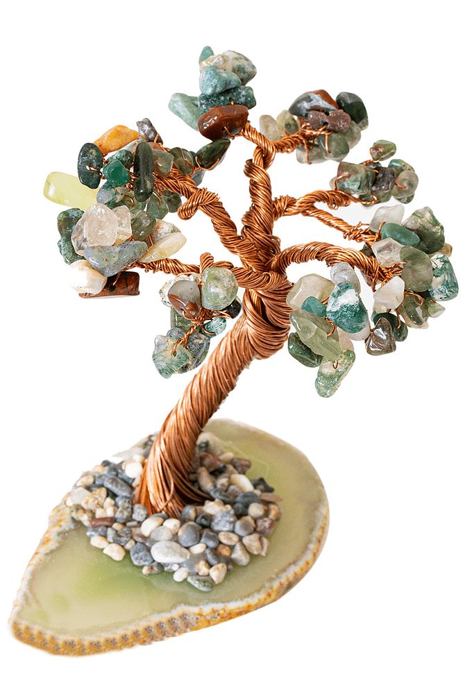 Piyasada bulunan diğer doğal taş ağaçların aksine, maksimum seviyede doğal olması için, plastik ve türevleri, ağır yapıştırıcılar ya da kimyasallar kullanılmamıştır. Enerjisel anlamda kayıp yaşamaması için saf bakır tellere, gerçek freeform dediğimiz kırık taşlar dizilmiştir. Freeform seçilmesinin amacı yaprak formuna çok yakın bir görsellik oluşturmasıdır. Kullanılan taş miktarı yüksektir, her dalda yaklaşık 10-12 adet taş bulunmaktadır. Ana gövdenin sabit durabilmesi için, yine gerçek taş olan akik plaka kullanılmış ve bakır tellerden geçen enerjinin tabanda toplanması sağlanmıştır. Gövde ile tabanı birleştirmek için organik bir yapıştırıcı kullanılmış. Görsel açıdan tamamlanması adına bu birleşme yeri gerçek kristal grubu taşlarla kapatılmıştır.