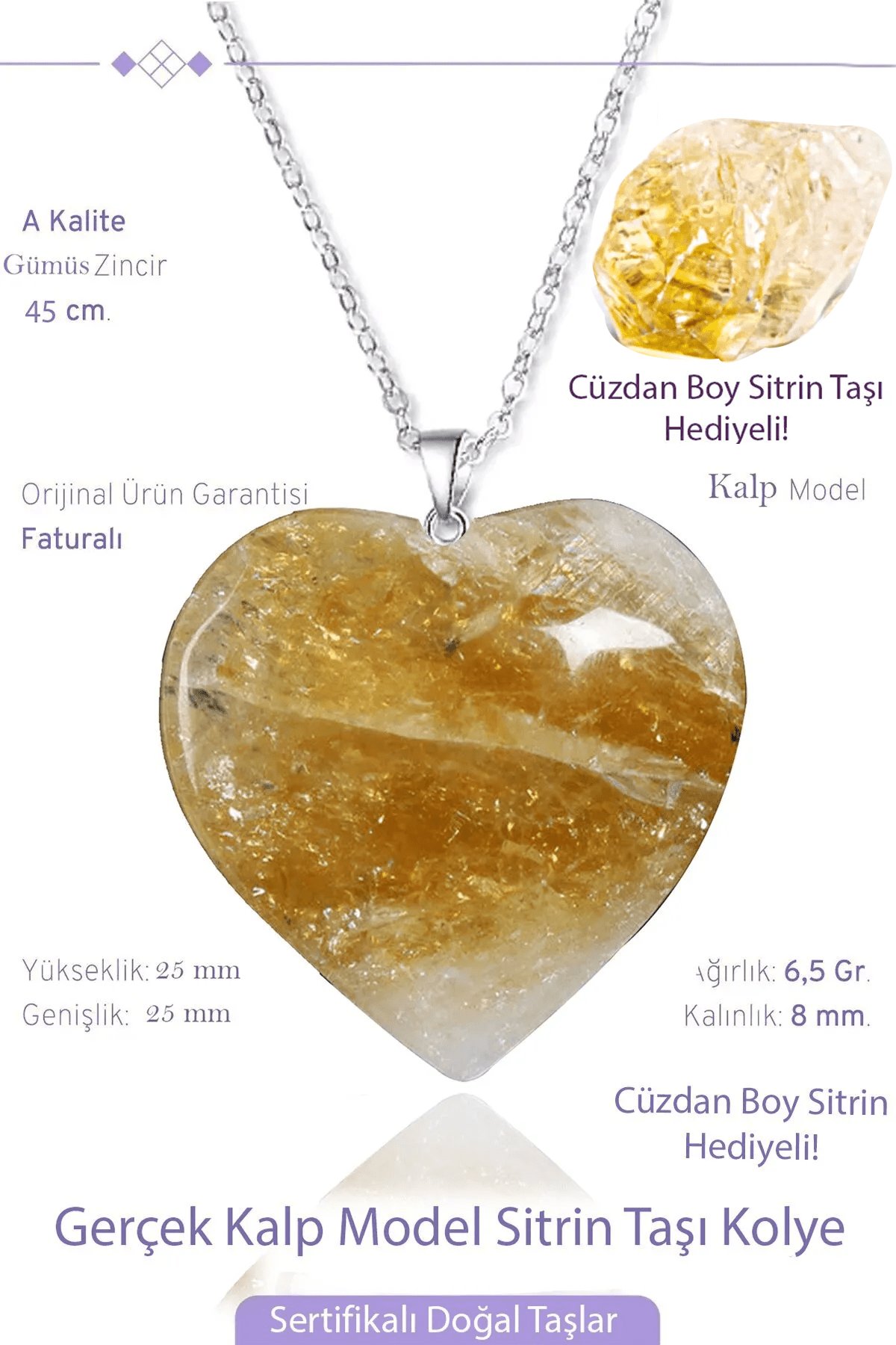 Sertifikalı Gerçek Kalp Model Sitrin Taşı Kolye (Bereket Taşı)