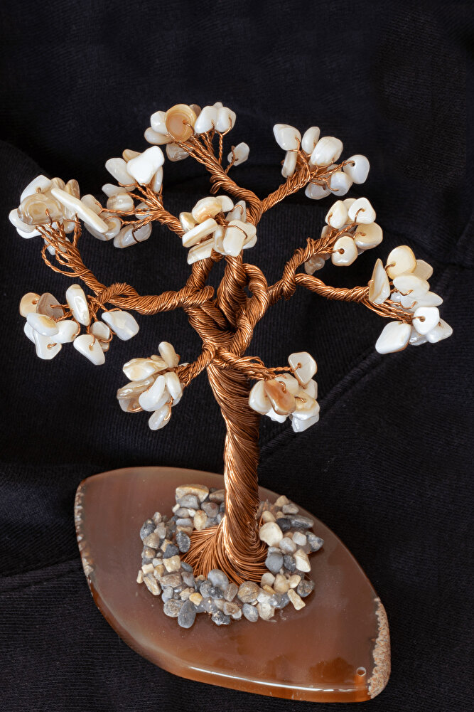 Piyasada bulunan diğer doğal taş ağaçların aksine, maksimum seviyede doğal olması için, plastik ve türevleri, ağır yapıştırıcılar ya da kimyasallar kullanılmamıştır. Enerjisel anlamda kayıp yaşamaması için saf bakır tellere, gerçek freeform dediğimiz kırık taşlar dizilmiştir. Freeform seçilmesinin amacı yaprak formuna çok yakın bir görsellik oluşturmasıdır. Kullanılan taş miktarı yüksektir, her dalda yaklaşık 10-12 adet taş bulunmaktadır. Ana gövdenin sabit durabilmesi için, yine gerçek taş olan akik plaka kullanılmış ve bakır tellerden geçen enerjinin tabanda toplanması sağlanmıştır. Gövde ile tabanı birleştirmek için organik bir yapıştırıcı kullanılmış. Görsel açıdan tamamlanması adına bu birleşme yeri gerçek kristal grubu taşlarla kapatılmıştır.