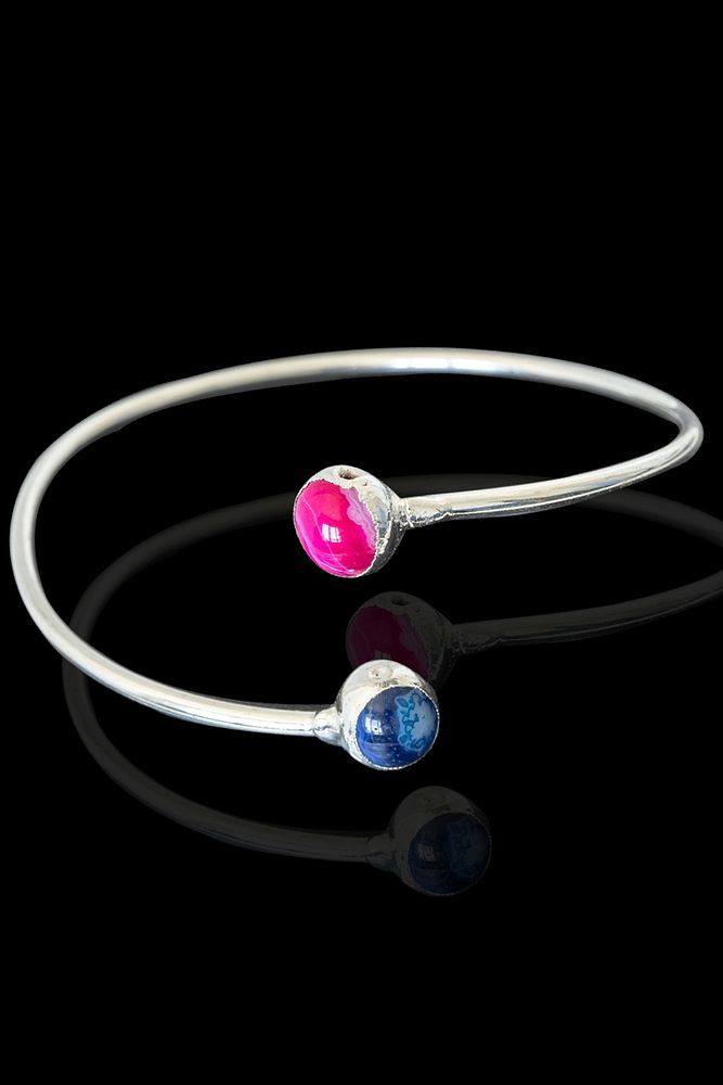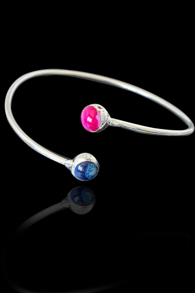 Sertifikalı Gümüş Renk Kelepçe Model Bileklik - (Pembe Akik - Mavi Akik Taşı)