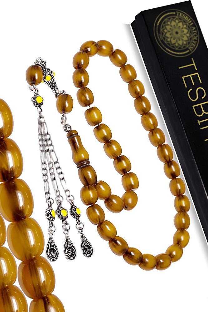 (Baş Ağrısı Sinir ve Stres) Tesbih Atölyesi, Sıkma kehribar tesbih, tasarımları özel olarak usta ellerde tasarlanır. Tasarımlarımız el yapımı olup sınırlı adette üretilmektedir. Tasarımlarda kullanılan püsküller düşük ayar gümüşten imal edilir. Tasarımlarda kullanılan kehribar taneleri hareli özel kalıplardan yapılır. Yapay reçine ile üretilmektedir. Ürünlerimiz renk almakta ve koku vermektedirler. Bu tasarımda; Sarı renkli yoğun hareli osmanlı benzetmesi renk alan kaliteli dabbas çubuk sıkma kehribar reçine kullanılmıştır. Her kehribar tanesi birbirinin aynısı olmadığı için küçükte olsa farklılıklar gösterebilir. Üretildiği Malzeme; Sıkma Kehribar; Ana Renk; Sarı Renk; Ağırlık; 20-30 gr; Tane Şekli; 10.5x11.5 mm; Tane Ölçüsü; Fıçı Kesim; Toplam Uzunluk; 20-30 cm; İmame ve Püskül Maddesi; Düşük Ayar Gümüş;