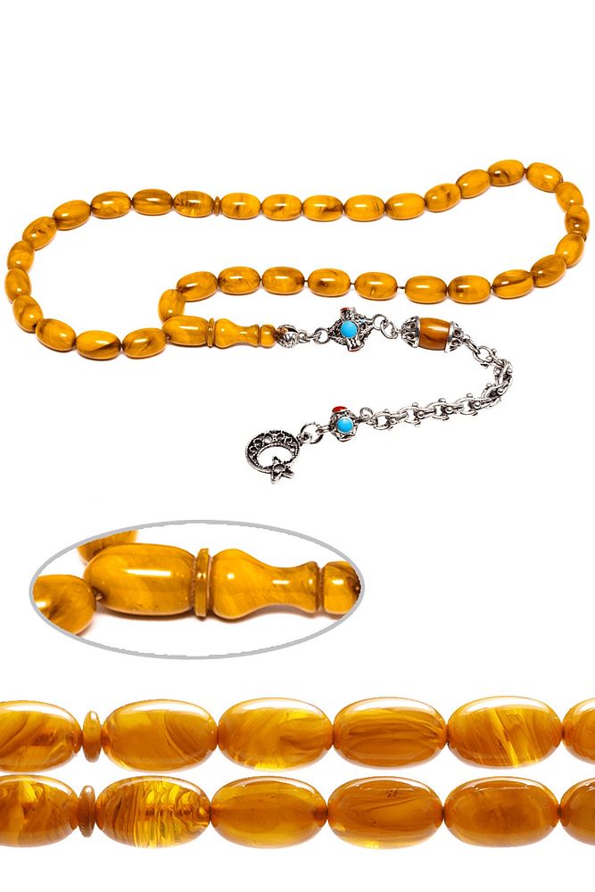 Ürün ya da Doğal Taş Açıklaması; ; (Baş Ağrısı Sinir ve Stres); ; Tesbih Atölyesi, Sıkma kehribar tesbih, tasarımları özel olarak usta ellerde tasarlanır. Tasarımlarımız el yapımı olup sınırlı adette üretilmektedir. Tasarımlarda kullanılan püsküller düşük ayar gümüşten imal edilir. Tasarımlarda kullanılan kehribar taneleri hareli özel kalıplardan yapılır. Yapay reçine ile üretilmektedir. Ürünlerimiz renk almakta ve koku vermektedirler. ; ; Bu tasarımda; Yoğun sarı renkli muhteşem kalitede 1.kalite sıkma kehribar reçine kullanılmıştır. Her kehribar tanesi birbirinin aynısı olmadığı için küçükte olsa farklılıklar gösterebilir.; ; Üretildiği Malzeme; Sıkma Kehribar; Ana Renk; Sarı Renk; Ağırlık; 20-30 gr; Tane Şekli; 8x12 mm; Tane Ölçüsü; Kapsül Kesim; Toplam Uzunluk; 20-30 cm; İmame ve Püskül Maddesi; Düşük Ayar Gümüş;