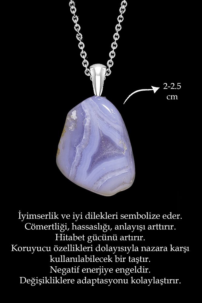 Bu doğal taş kolye tasarımımızda; Kalsedon taşı kullanılmıştır. Zincir ölçüsü 45 cm\'dir. Her için uyumludur. Yetişkin ve çocuk için kullanılabilir. %100 Orijinal ve gerçek taştır. Sinirinizi stresinizi alacak, mineral açısından oldukça zengin olduğu için bulunduğu için teniniz ile temas eder etmez aradaki farkı kısa bir süre içinde hissedeceksiniz.