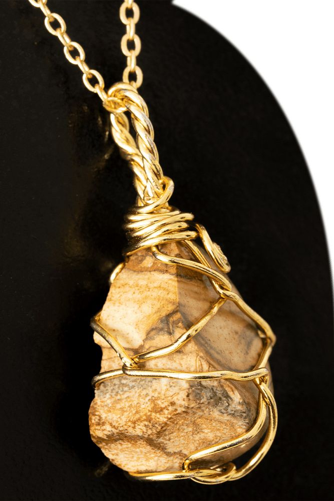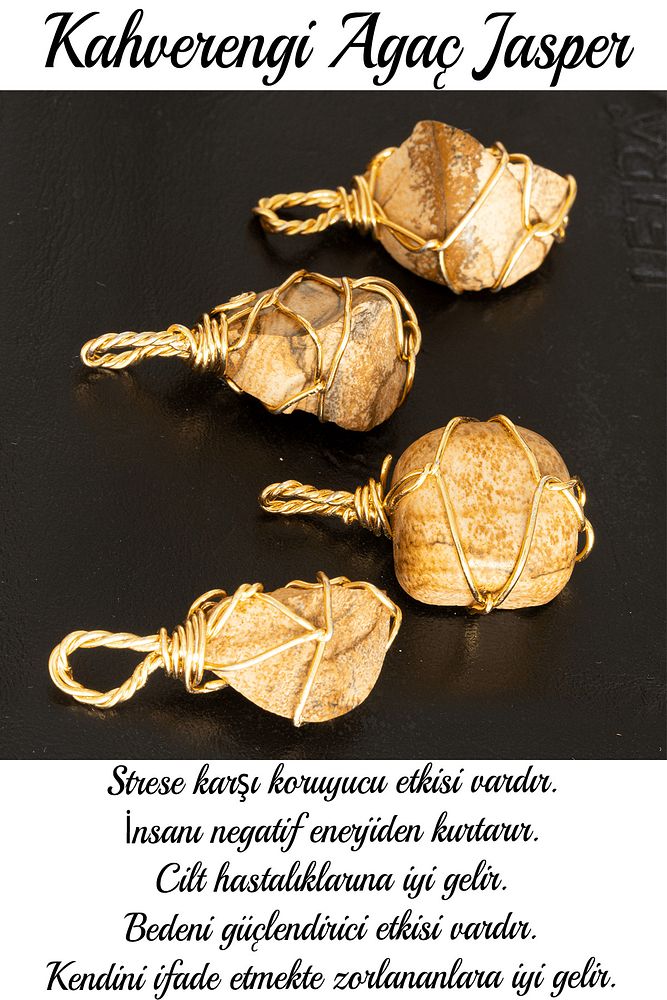 Sertifikalı Ham Tel Sargılı Kahverengi Ağaç Jasper Taşı Kolye - Altın Kaplama