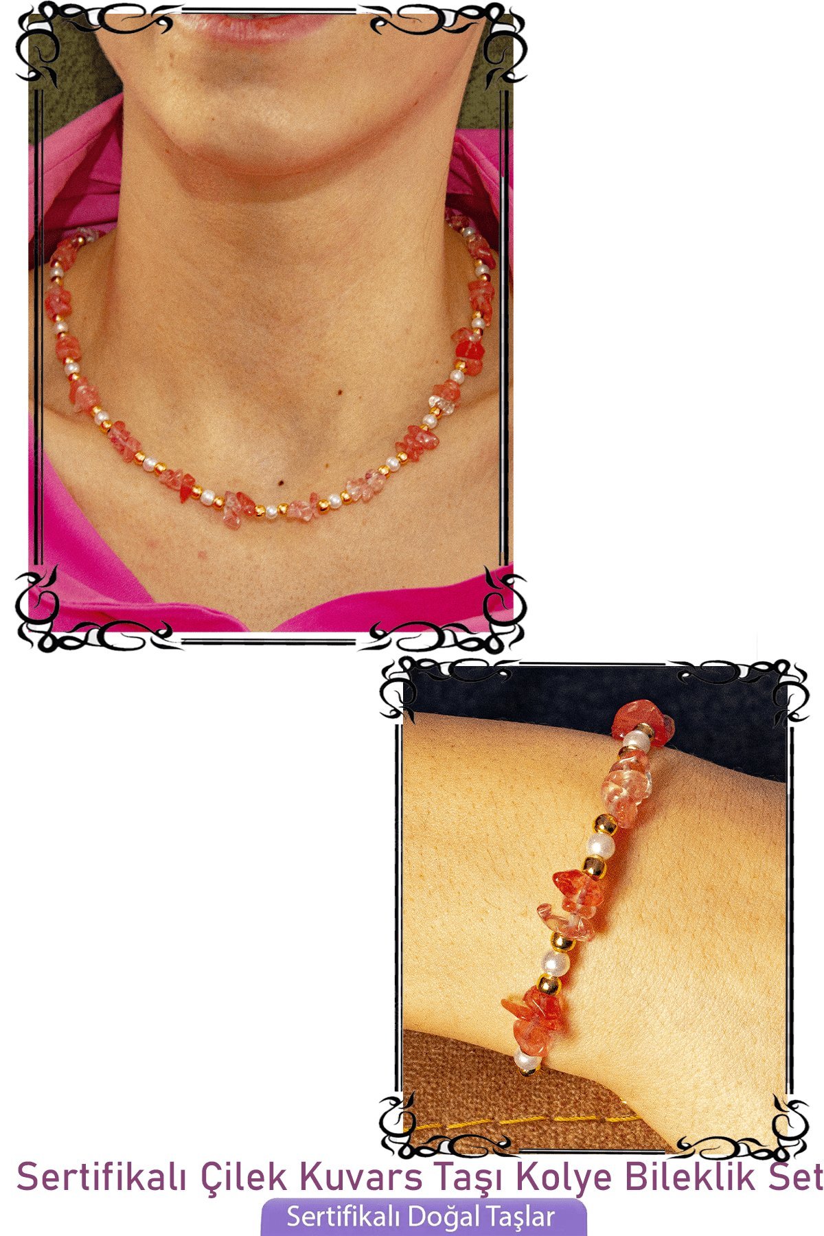 Bu doğal taş kolye tasarımımızda; Çilek Kuvars taşı kullanılmıştır. Kolye ölçüsü 45 cm'dir. Her için uyumludur. Yetişkin ve çocuk için kullanılabilir. %100 Orijinal ve gerçek taştır. Sinirinizi stresinizi alacak, mineral açısından oldukça zengin olduğu için bulunduğu için teniniz ile temas eder etmez aradaki farkı kısa bir süre içinde hissedeceksiniz.
