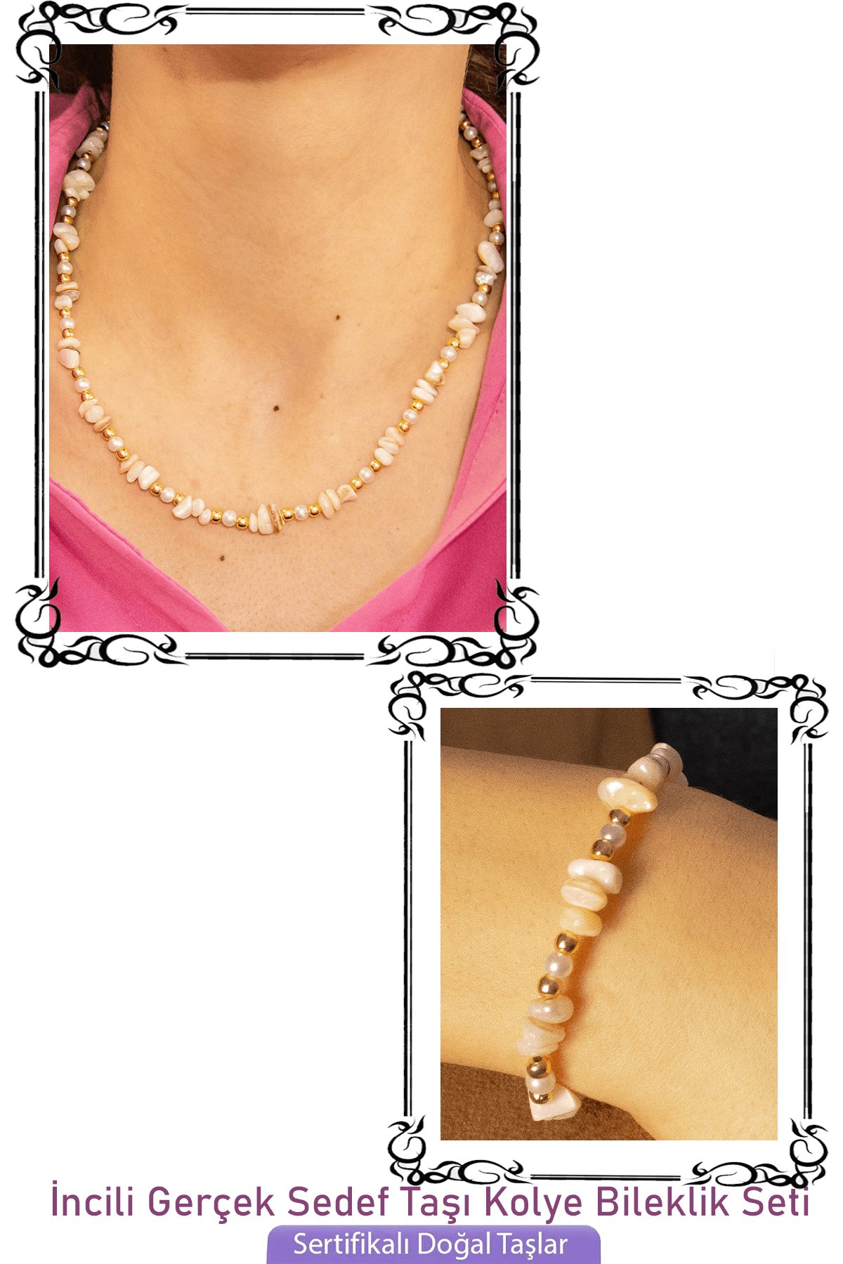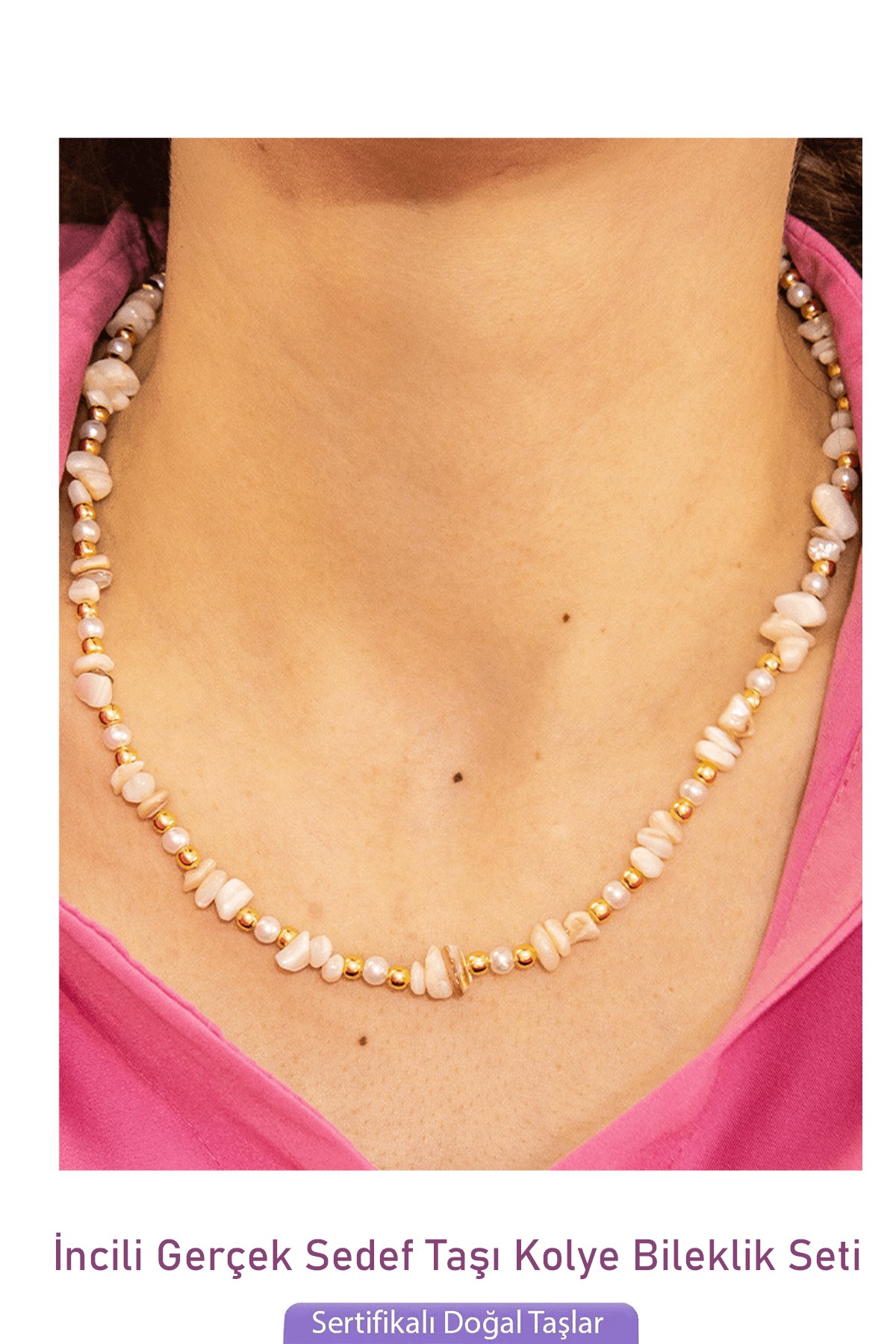 Sertifikalı İncili Doğal Sedef Taşlı Doğal Taş Kolye Bileklik Seti