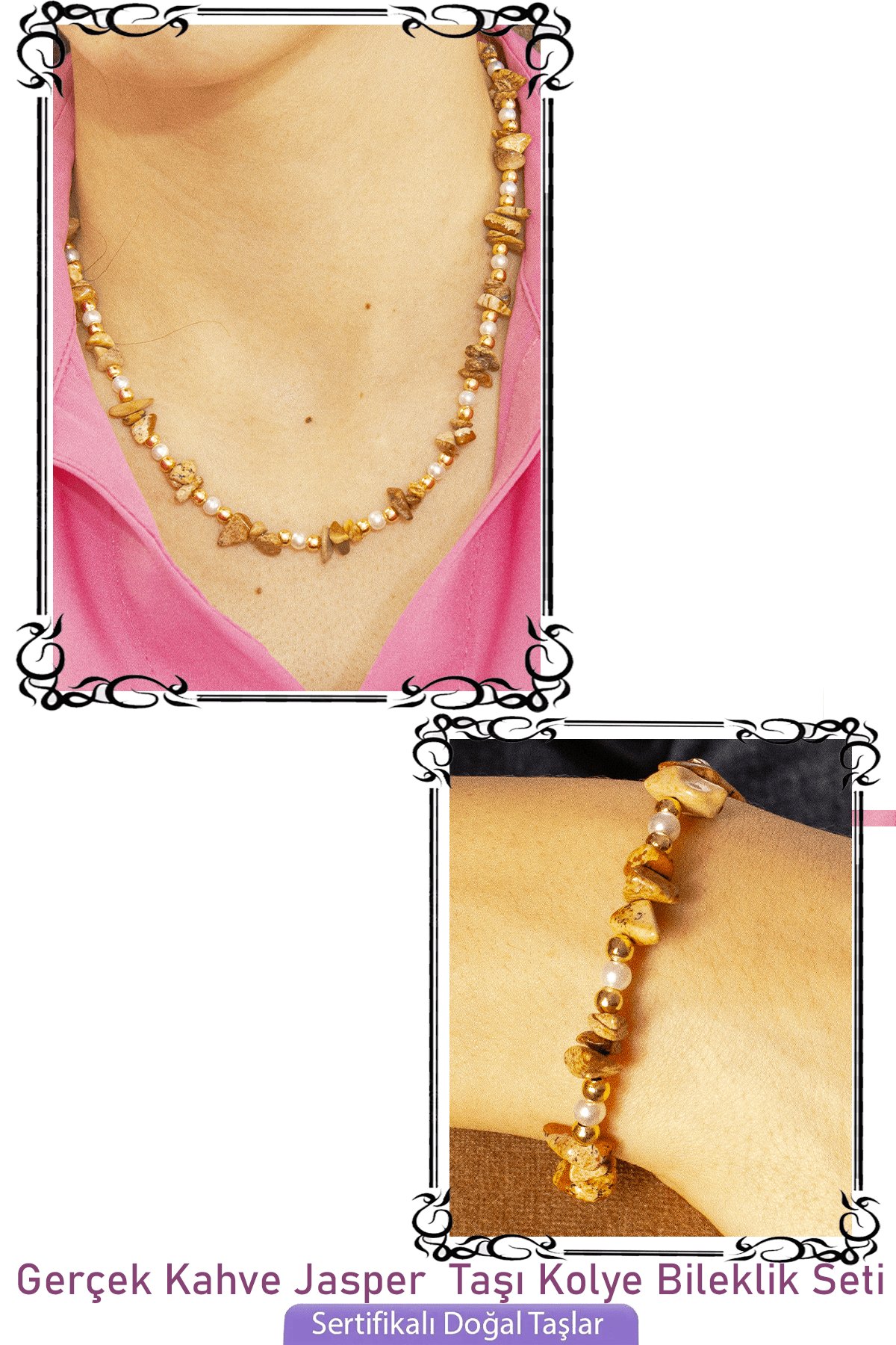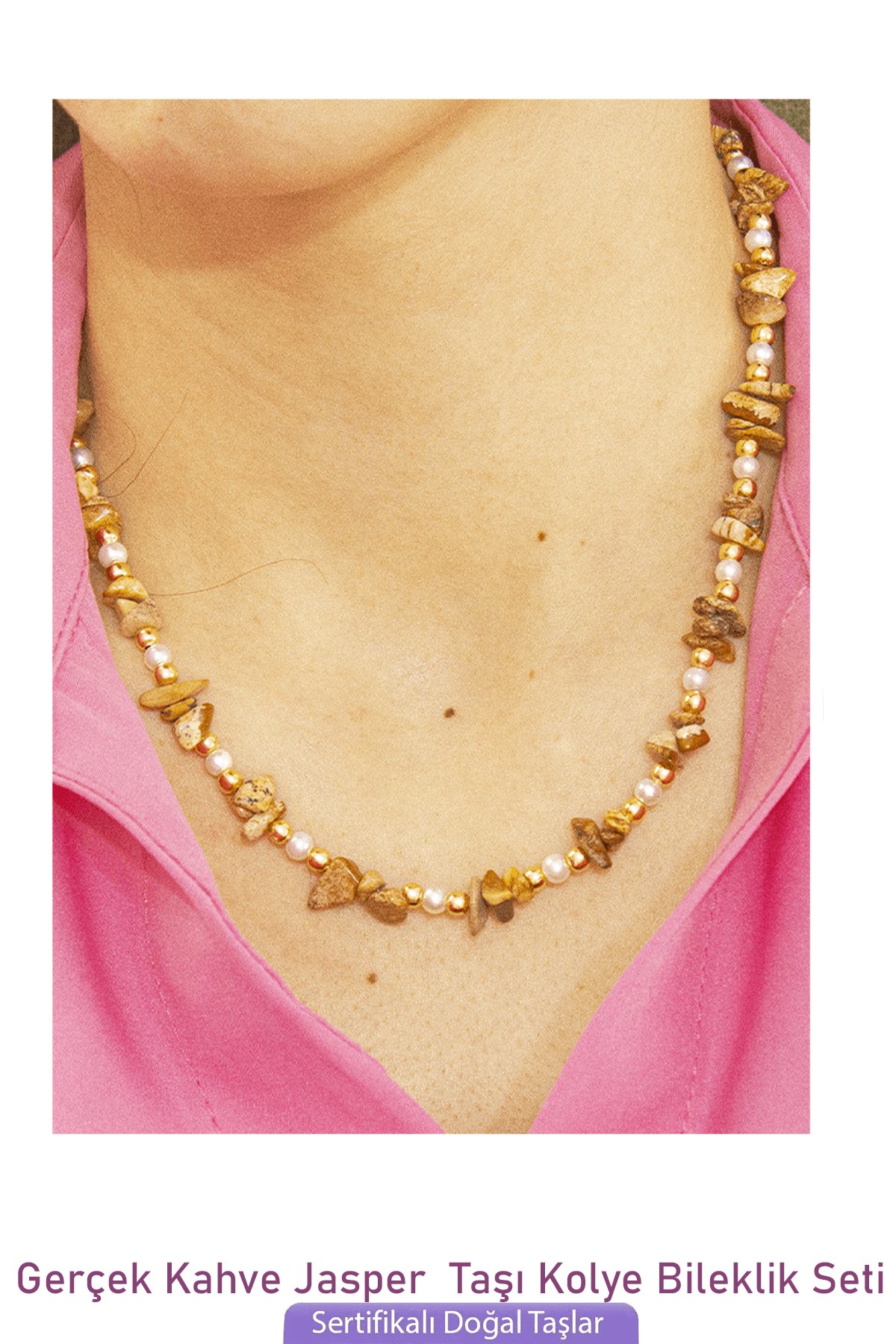 Sertifikalı İncili Kahverengi Jasper Taşlı Doğal Taş Kolye Bileklik Seti