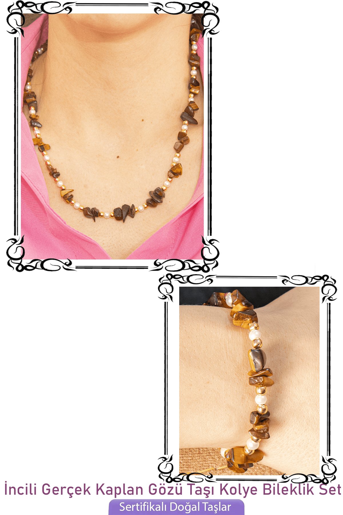 Sertifikalı İncili Kaplan Gözü Taşlı Doğal Taş Kolye Bileklik Seti