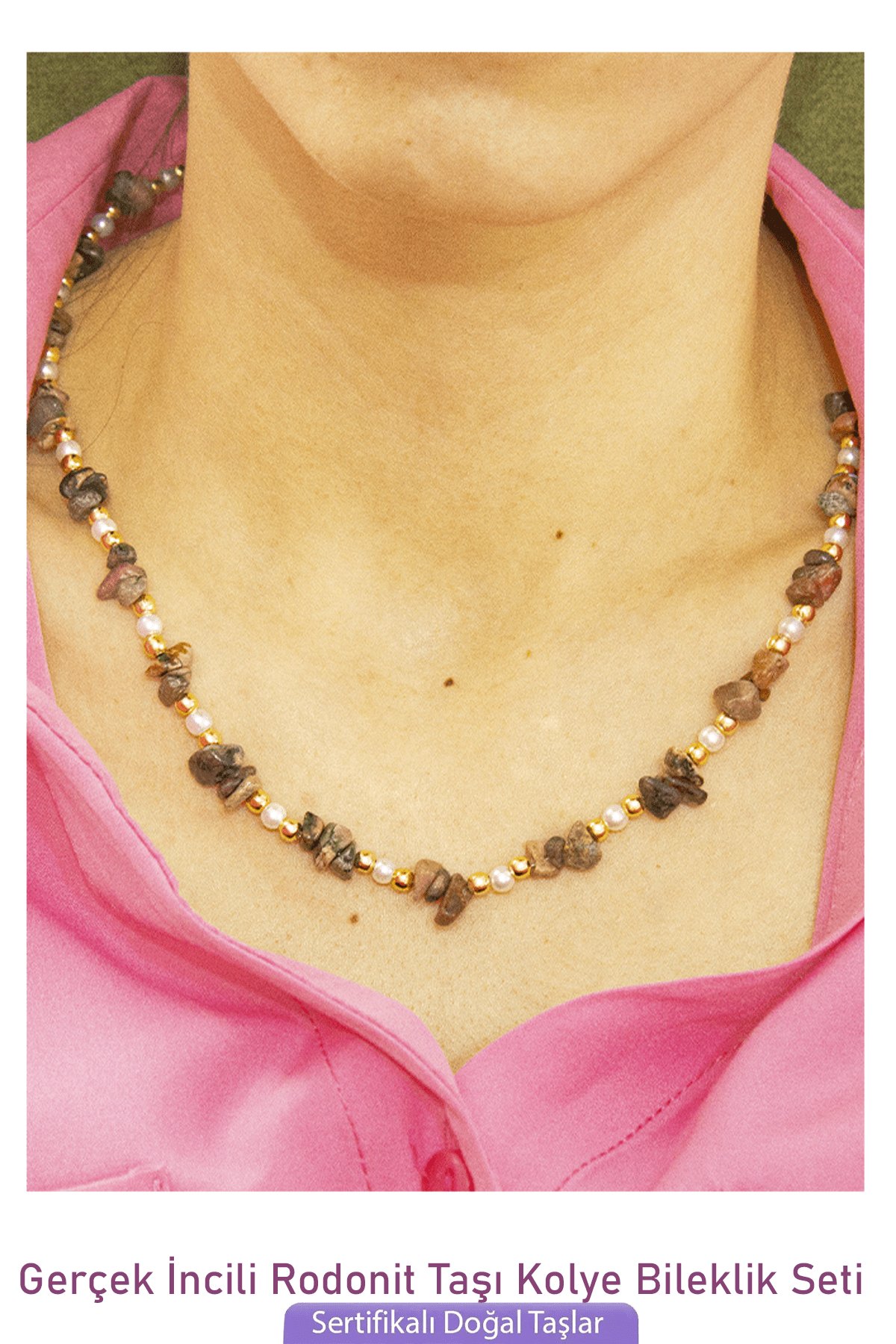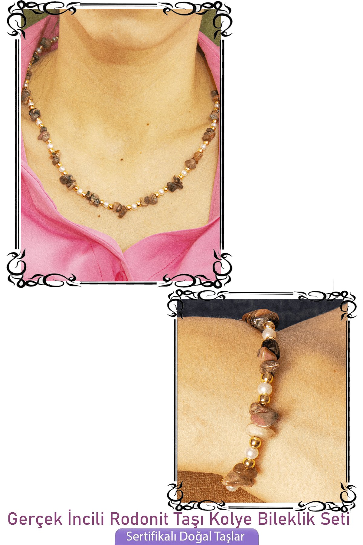 Sertifikalı İncili Rodonit Taşlı Doğal Taş Kolye Bileklik Seti