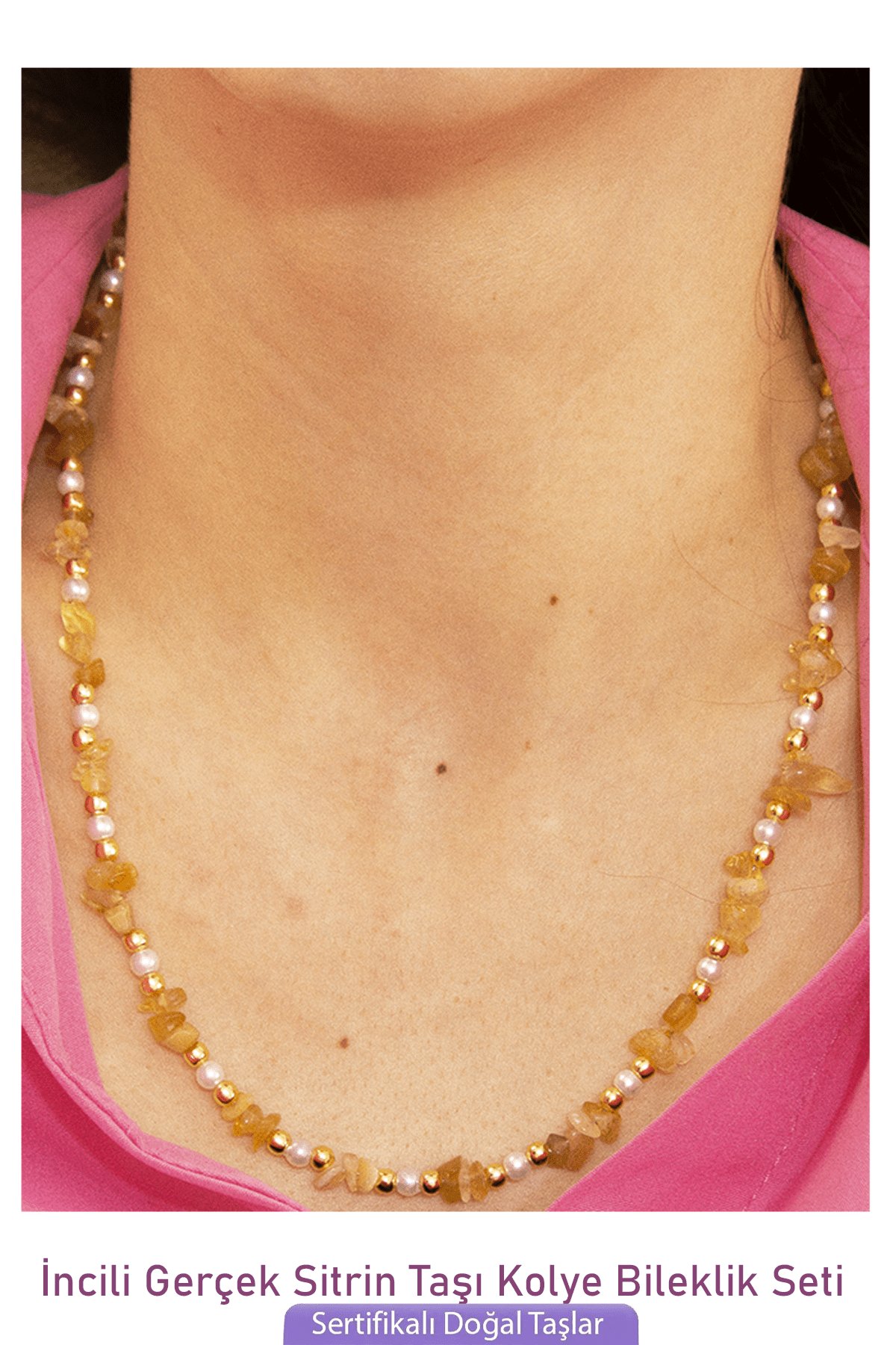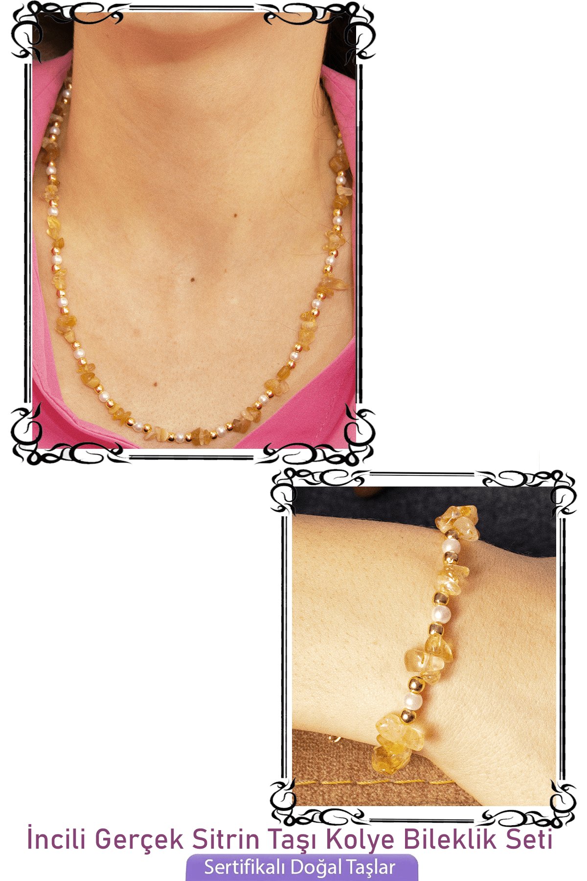Sertifikalı İncili Sitrin Taşlı Doğal Taş Kolye Bileklik Seti