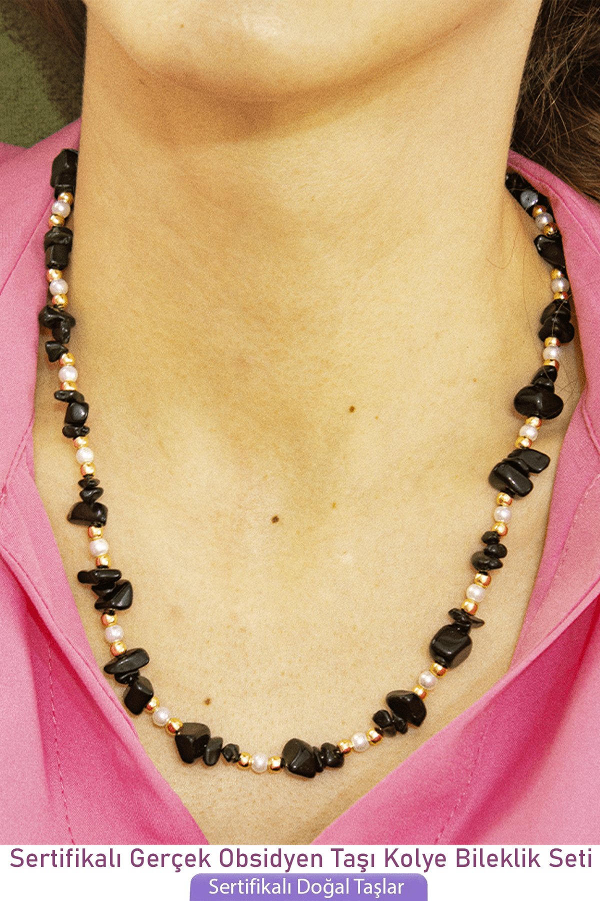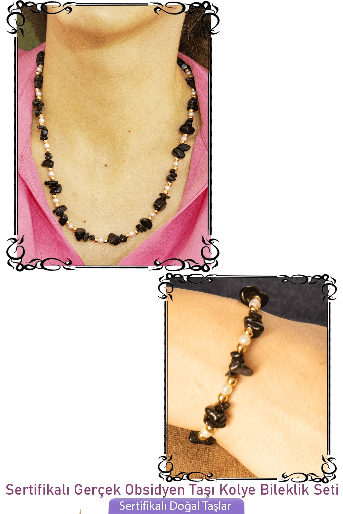 Sertifikalı İncili Siyah Obsidyen Taşlı Doğal Taş Kolye Bileklik Seti