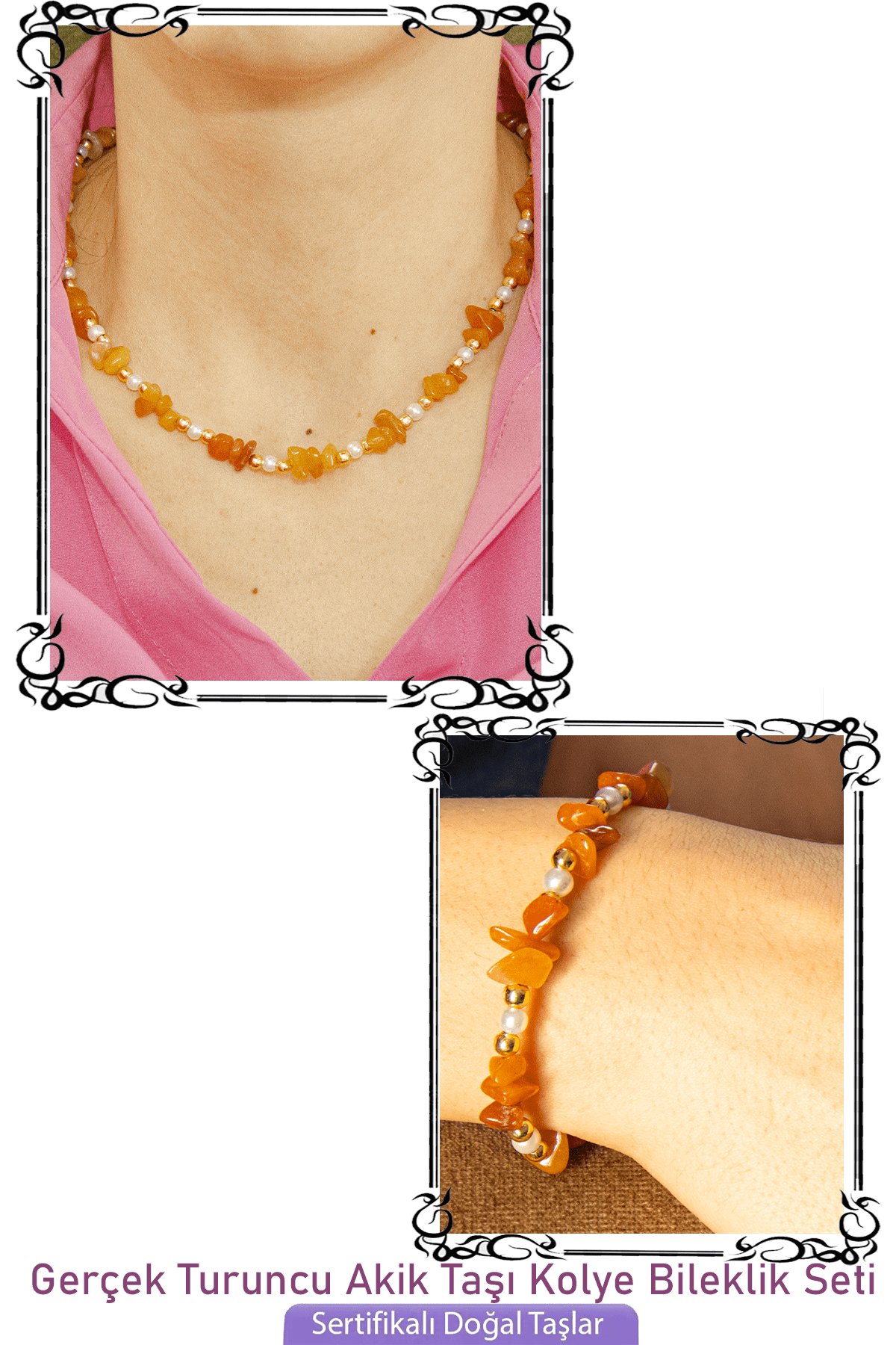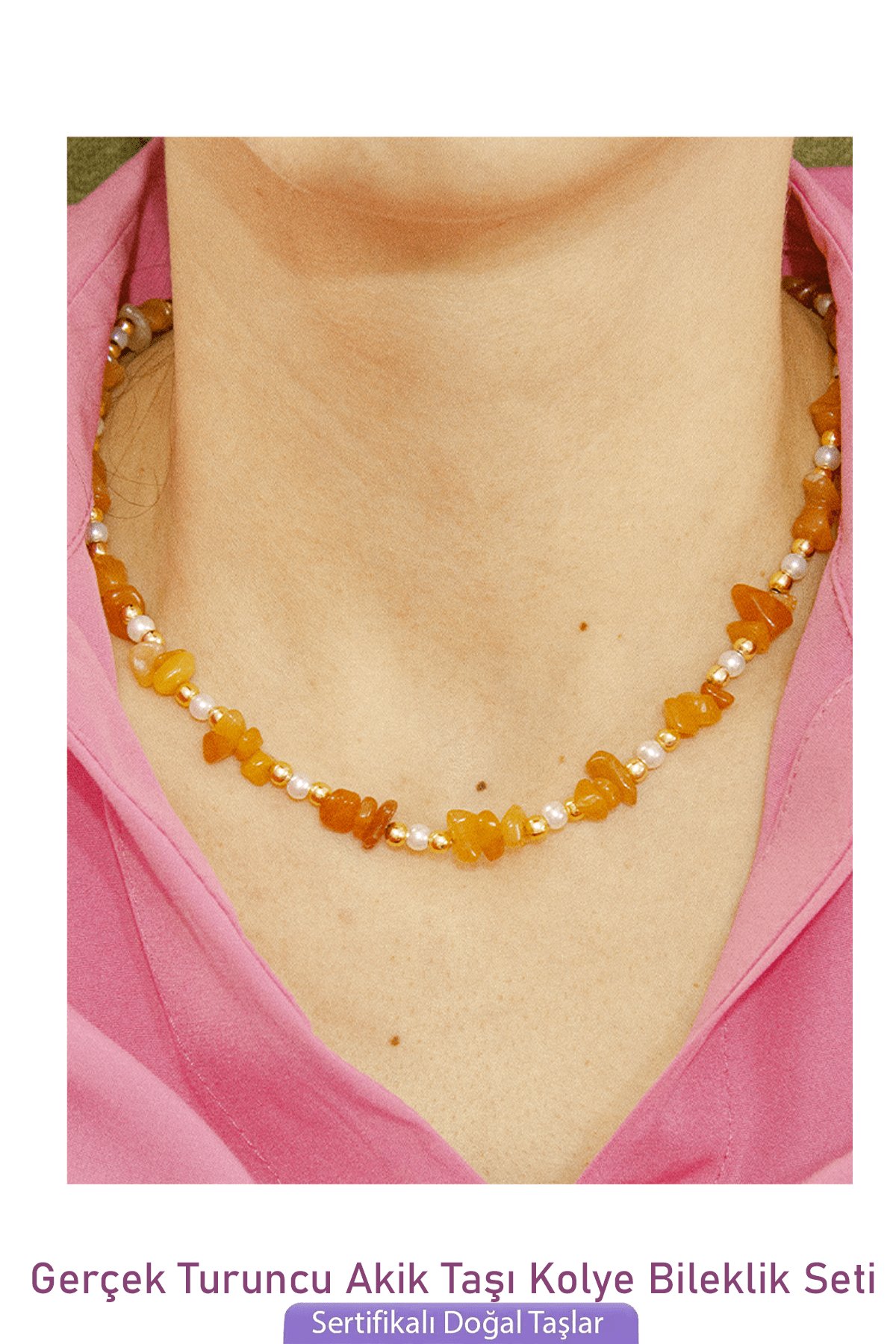 Sertifikalı İncili Turuncu Akik Taşlı Doğal Taş Kolye Bileklik Seti