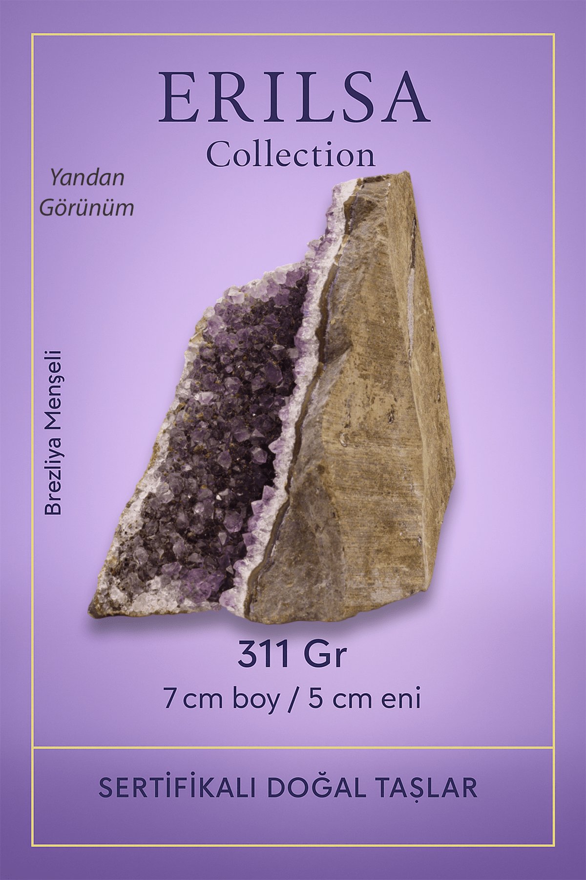 Benzersiz jeod yapısıyla dikkat çeken bu Brezilya menşeili ametist taşı, 311 gram ağırlığında olup 7 cm boy ve 5 cm enindedir. Taşın dış kısmı ham ve kayalık dokuda kalırken, iç kısmı doğal kristallerle kaplıdır. Koyu mor ametist kristalleriyle zenginleşmiş bu yapı, koleksiyonluk ve estetik kullanım açısından üst düzey bir seçenektir. %100 ham ve işlenmemiş olarak sunulmaktadır.