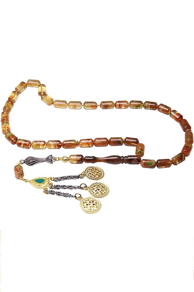 (Baş Ağrısı Sinir ve Stres); ; Tesbih Atölyesi, Sıkma kehribar tesbih, tasarımları özel olarak usta ellerde tasarlanır. Tasarımlarımız el yapımı olup sınırlı adette üretilmektedir. Tasarımlarda kullanılan püsküller düşük ayar gümüşten imal edilir. Tasarımlarda kullanılan kehribar taneleri hareli özel kalıplardan yapılır. Yapay reçine ile üretilmektedir. Ürünlerimiz renk almakta ve koku vermektedirler. ; ; Bu tasarımda; Renk hareli özel yeşil ve kahverengi renklerinden oluşan renk alan kaliteli sıkma kehribar reçine kullanılmıştır. Her kehribar tanesi birbirinin aynısı olmadığı için küçükte olsa farklılıklar gösterebilir.; ; Üretildiği Malzeme; Sıkma Kehribar; Ana Renk; Yeşil ve Kahverengi Renk; Ağırlık; 20-30 gr; Tane Şekli; 8x12 mm; Tane Ölçüsü; Kapsül Kesim; Toplam Uzunluk; 20-30 cm; İmame ve Püskül Maddesi; Düşük Ayar Gümüş ;