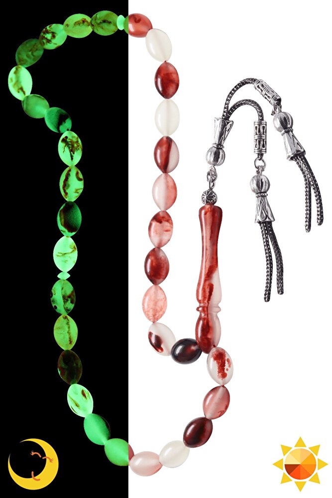 Ürün ya da Doğal Taş Açıklaması (Karanlıkta Fosforlu Parlayan Kedigözü Tesbih) Kedi gözü tesbih modelleri, ''Tesbih Atölyesi'' Atölyelerinde ustalarımız tarafından kuru torna işciliği ile elde özen ile tane tane işlenmektedir. Ürünlerimiz el işciliği olduğu için sınırlı sayıda üretilmektedir. Tasarımlarımızda kullandığımız taşlar Dünya'nın en kaliteli taşlarını ithal etmekteyiz. Bu tasarımda; ''Işık ile enerji olan karanlıkta fosforlu parlayan kırmızı parçacıklı arizona kedi gözü kullanılmıştır.'Çift kaplama rodaj sistemi uygulandığı için renk atmaz ve kararmaz bir yapıya sahiptir. Üretildiği Taş; Kedi Gözü; Ana Renk; Kırmızı - Yeşil Renk Alır; Ağırlık; 20-30 gr; Tane Şekli; 8x11 mm; Tane Ölçüsü; Beyzi Kesim; Toplam Uzunluk; 20-30 cm; İmame ve Püskül Maddesi; Düşük Ayar Gümüş;