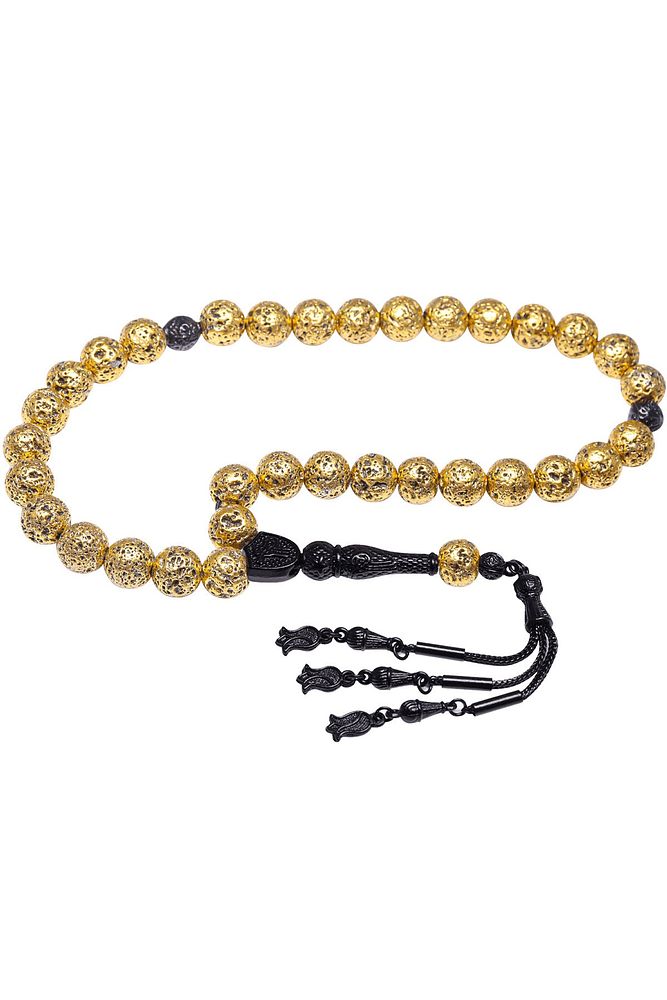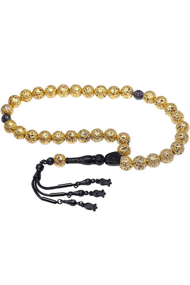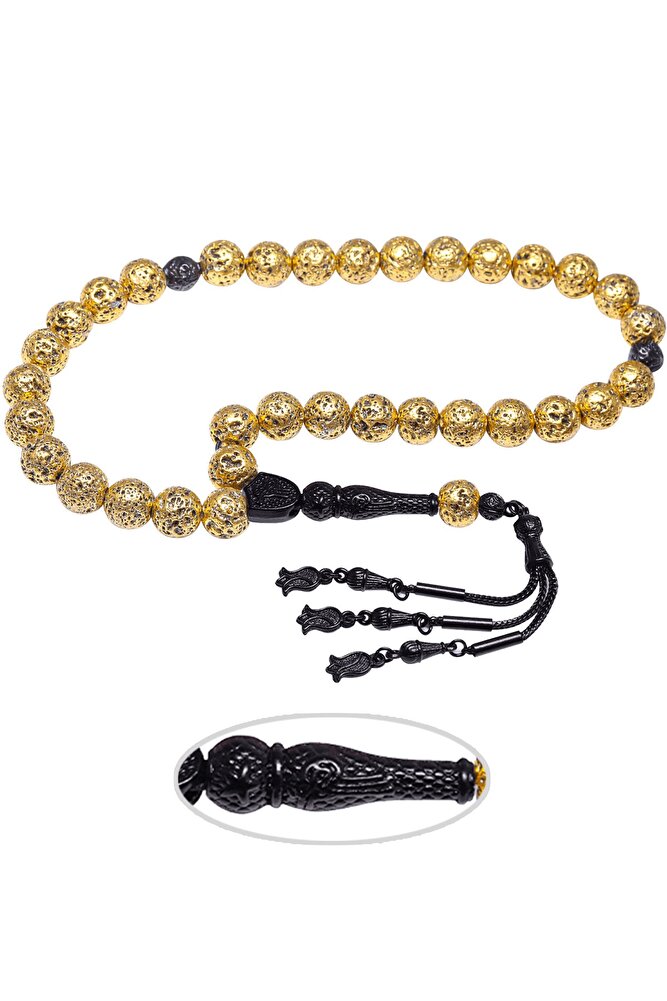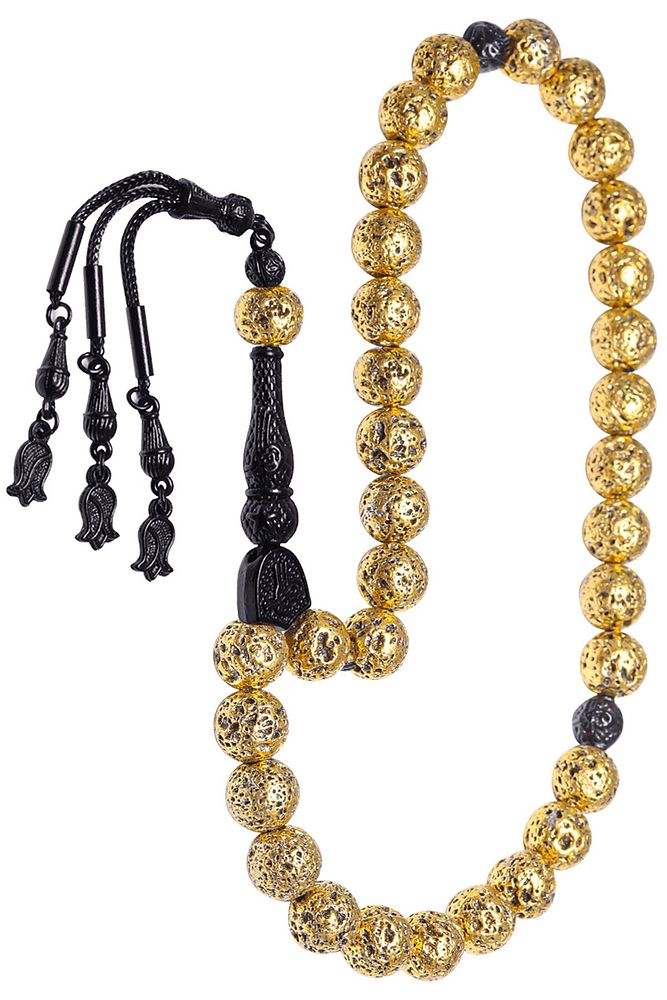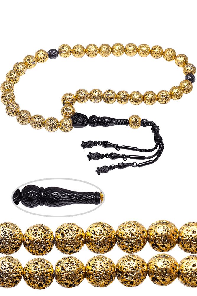 ; (Volkanik Enerji Yanardağ Taşı); ; Lav taşı tesbih modelleri, ''Tesbih Atölyesi'' Atölyelerinde ustalarımız tarafından kuru torna işciliği ile elde özen ile tane tane işlenmektedir. Ürünlerimiz el işciliği olduğu için sınırlı sayıda üretilmektedir. Tasarımlarımızda kullandığımız taşlar Dünya'nın en kaliteli doğal taşlarını ithal etmekteyiz. Tasarımlarımızda kullandığımız doğal taşların hiç biri birbirinin aynısı olmadığı için küçükte olsa farklılık gösterebilir. Yanardağların patlaması sonucu elde edilen lav taşlarından üretilmektedir.; ; Bu tasarımda; Sarı renkli doğal volkanik yanardağ tüfü lav taşı ve Siyah nikel alaşımlı imame ve püskül seti kullanılmıştır. Çift kaplama atıldığı için renk atmaz ve kararmaz bir yapıya sahiptir. Yedek ip ile gönderim sağlanır. ; ; Üretildiği Taş; Lav Taşı; Ana Renk; Altın Kaplama Renk; Ağırlık; 20-30 gr; Tane Şekli; 8x8 mm; Tane Ölçüsü; Küre Kesim; Toplam Uzunluk; 20-30 cm; İmame ve Püskül Maddesi; Nikel Alaşımlı;