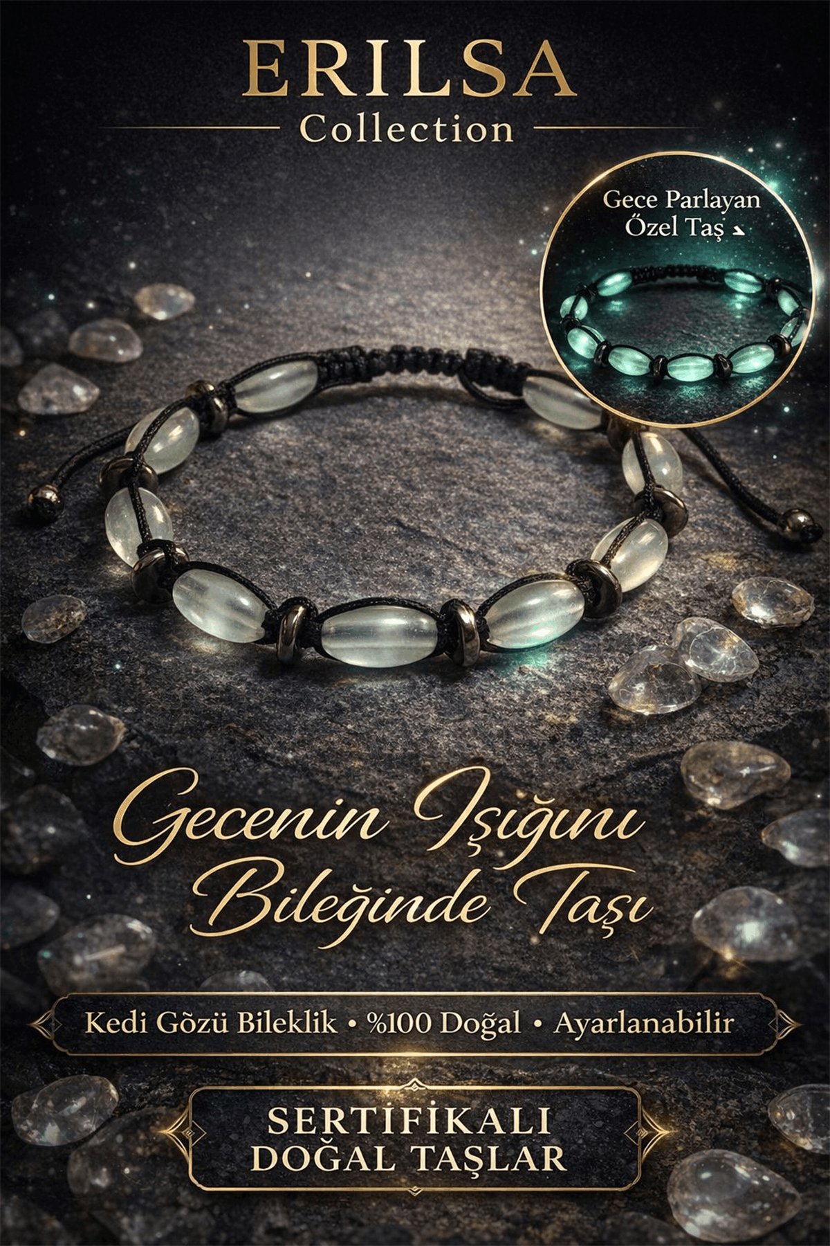 Sertifikalı Kedi Gözü Bileklik - 10mm Arpa Kesim Fosforlu Gece Parlayan Akrilik Kehribar Makrome