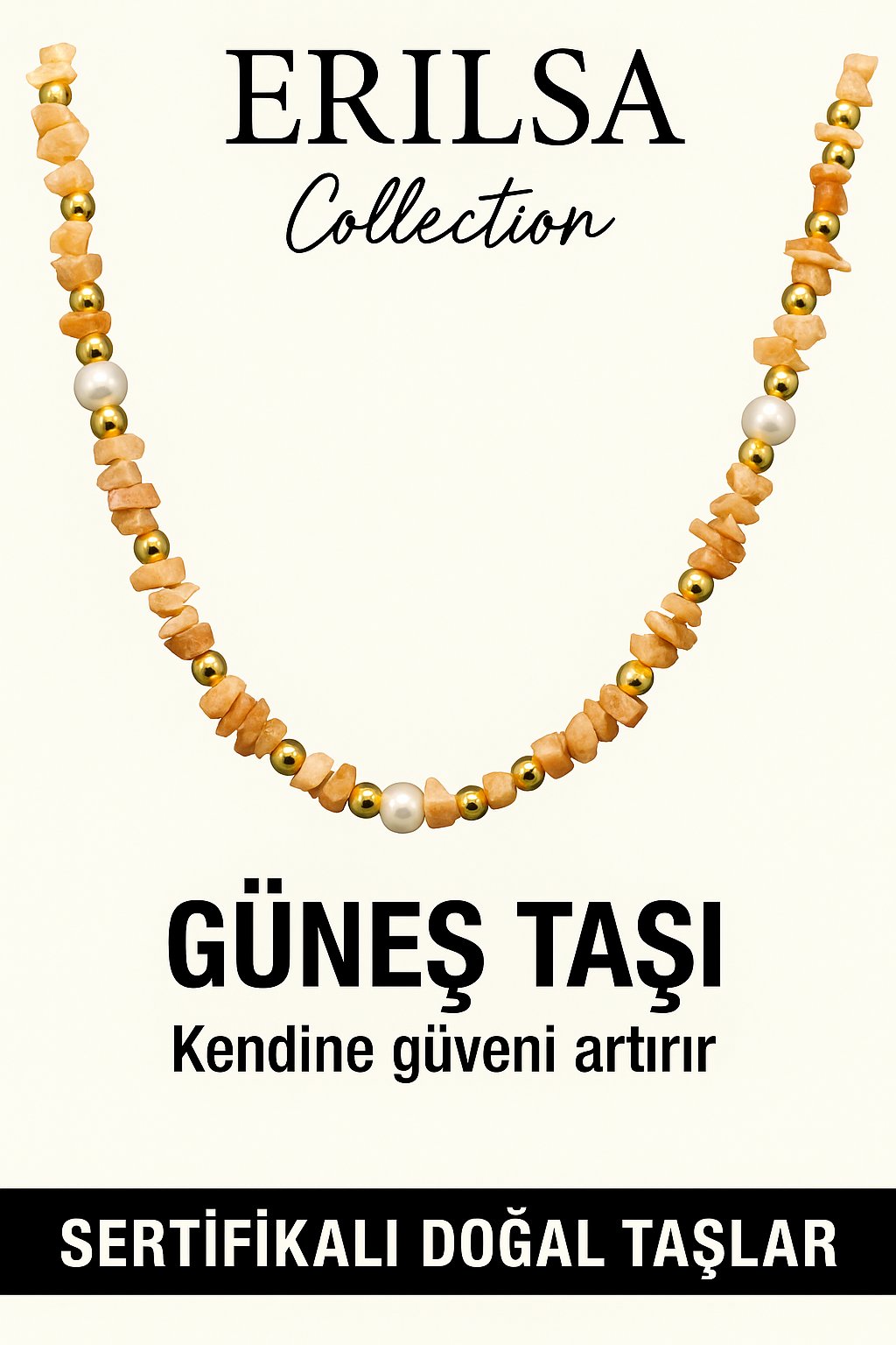 4–6 mm kırık güneş taşı boncuklar ve 4 mm doğal inci detayları, altın kaplama paslanmaz çelik zincir üzerinde bir araya gelerek hem modern hem zamansız bir şıklık sunar. Minimal altın küpe ve ince bilekliklerle katmanlı kullanım önerilir.