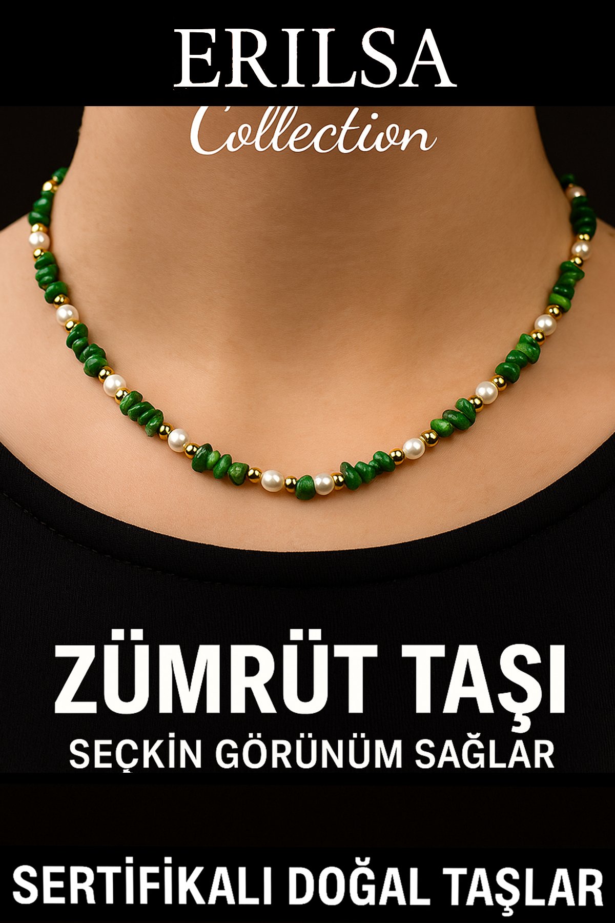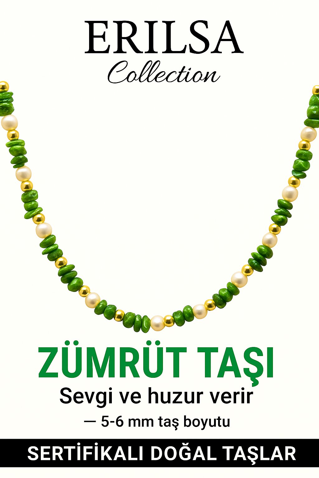 %100 doğal zümrüt ve inci boncukları, Erilsa Collection sertifikasıyla özenle seçilip hazırlanmıştır.