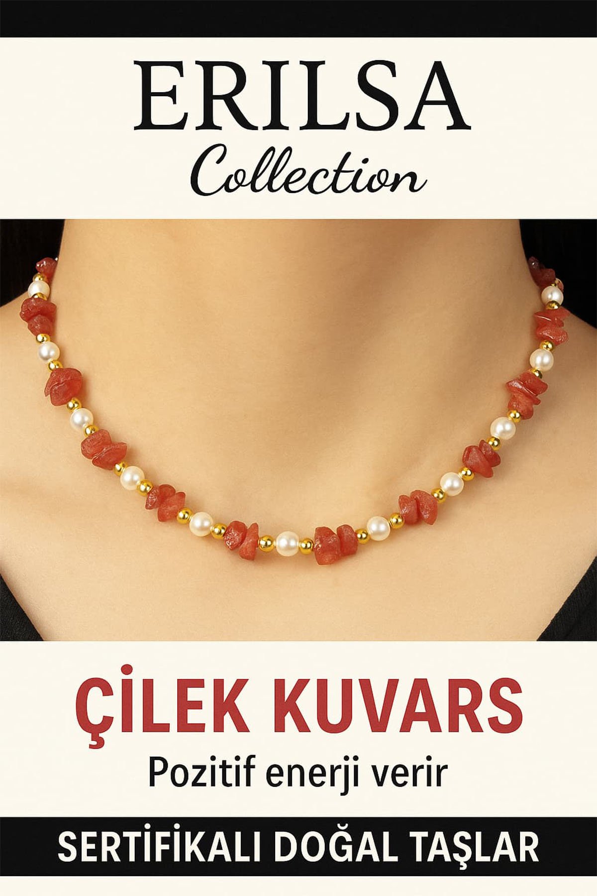 Sertifikalı kırık çilek kuvars ve inci taşlarından oluşan bu kolye, ince işçiliğiyle kalp çakrası dengesini destekler.