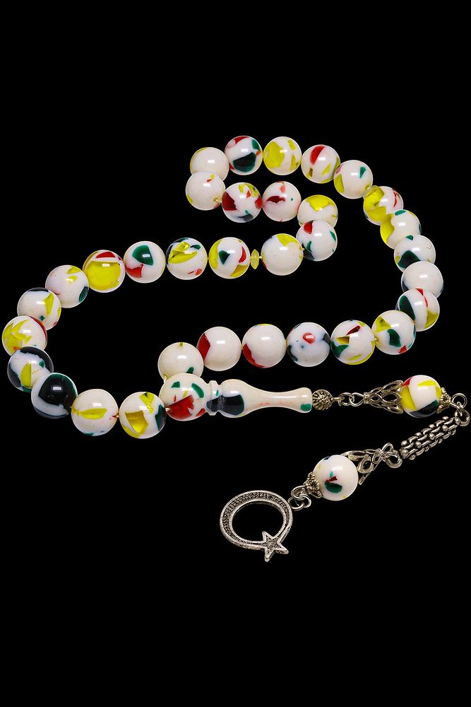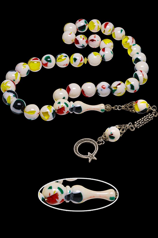 (Para - Sağlık - Pozitif Enerji Taşı); ; Toz Kehribar Tesbih modelleri, ''Tesbih Atölyesi'' Atölyelerinde ustalarımız tarafından kuru torna işciliği ile elde özen ile tane tane işlenmektedir. Ürünlerimiz el işciliği olduğu için sınırlı sayıda üretilmektedir. Tasarımlarımızda kullandığımız taşlar Dünya'nın en kaliteli yapay reçinesi kullanmaktayız. Toz kehribar tesbih modellerimizin kalite olarak ateş ve sıkma kehribardan hiç bir farkı yoktur. Aradaki tek fark ateş ve sıkma kehribar tesbihin renk almasıdır.; ; Bu tasarımda; Parçacıklı çeşitli renklerden oluşan küre kesim toz kehribar kullanılmıştır. İmame ve Püskül yapımında; Düşük ayar gümüş kullanılmıştır. Çift kaplama rodaj atıldığı için renk atmaz ve kararmaz bir yapıya sahiptir. ; ; Üretildiği Malzeme; Toz Kehribar; Ana Renk; Çeşitli Renk; Ağırlık; 20-30 gr; Tane Şekli; 10x10 mm; Tane Ölçüsü; Küre Kesim; Toplam Uzunluk; 20-30 cm; İmame ve Püskül Maddesi; Düşük Ayar Gümüş;