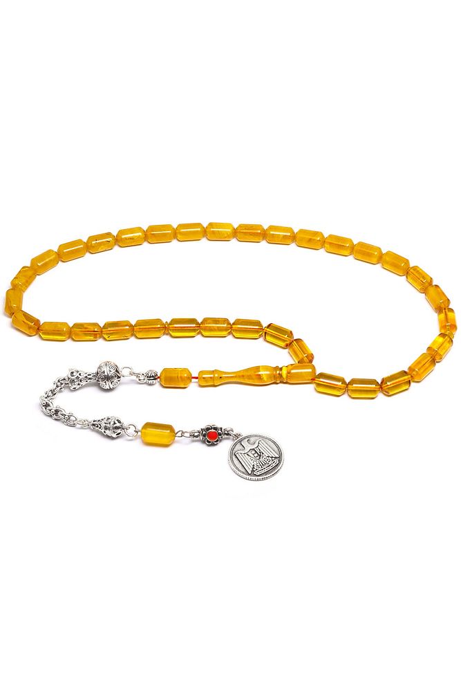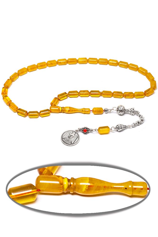 Sertifikalı Kral Püskül Sarı Şeffaf Renkli Hareli Sıkma Kehribar Tesbih