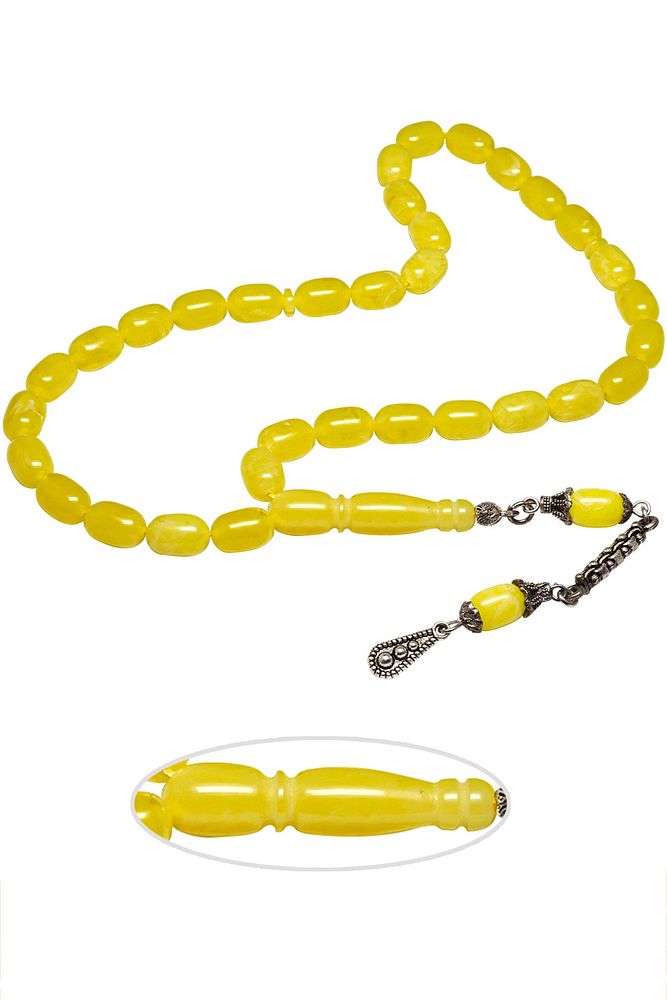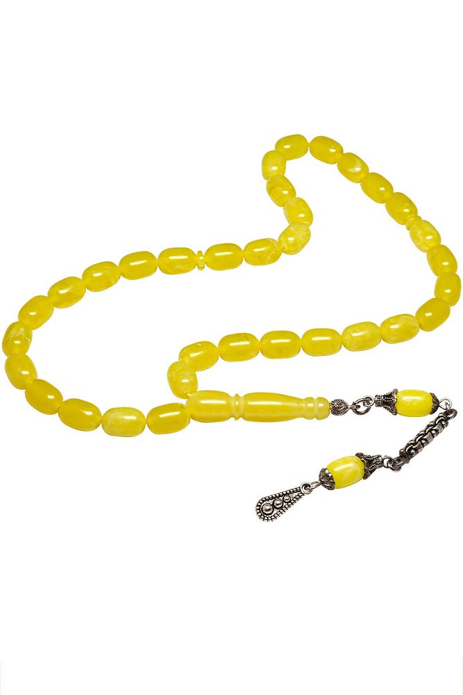 (Para - Sağlık - Pozitif Enerji Taşı); ; Beyrut Damla Kehribar Tesbih modelleri, ''Tesbih Atölyesi'' Atölyelerinde ustalarımız tarafından kuru torna işciliği ile elde özen ile tane tane işlenmektedir. Ürünlerimiz el işciliği olduğu için sınırlı sayıda üretilmektedir. Tasarımlarımızda kullandığımız taşlar Dünya'nın en kaliteli yapay reçinesi kullanmaktayız. Toz kehribar tesbih modellerimizin kalite olarak ateş ve sıkma kehribardan hiç bir farkı yoktur. Aradaki tek fark ateş ve sıkma kehribar tesbihin renk almasıdır.; ; Bu tasarımda; Beyrut damla kehribar kullanılmıştır. İmame ve Püskül yapımında; Düşük ayar gümüş kullanılmıştır. Çift kaplama rodaj atıldığı için renk atmaz ve kararmaz bir yapıya sahiptir. ; Üretildiği Malzeme; Beyrut Damla Kehribar; Ana Renk; Sarı Renk; Ağırlık; 20-30 gr; Tane Şekli; 6.5x10 mm; Tane Ölçüsü; Kapsül Kesim; Toplam Uzunluk; 20-30 cm; İmame ve Püskül Maddesi; Düşük Ayar Gümüş;