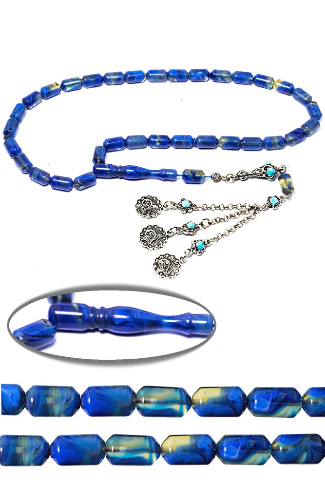 Üretildiği Malzeme : Sıkma Kehribar Ana Renk : Mavi Renk Ağırlık : 20-30 gr Tane Şekli : 8x12 mm Tane Ölçüsü : Kapsül Kesim Toplam Uzunluk : 20-30 cm İmame ve Püskül Maddesi : Düşük Ayar Gümüş