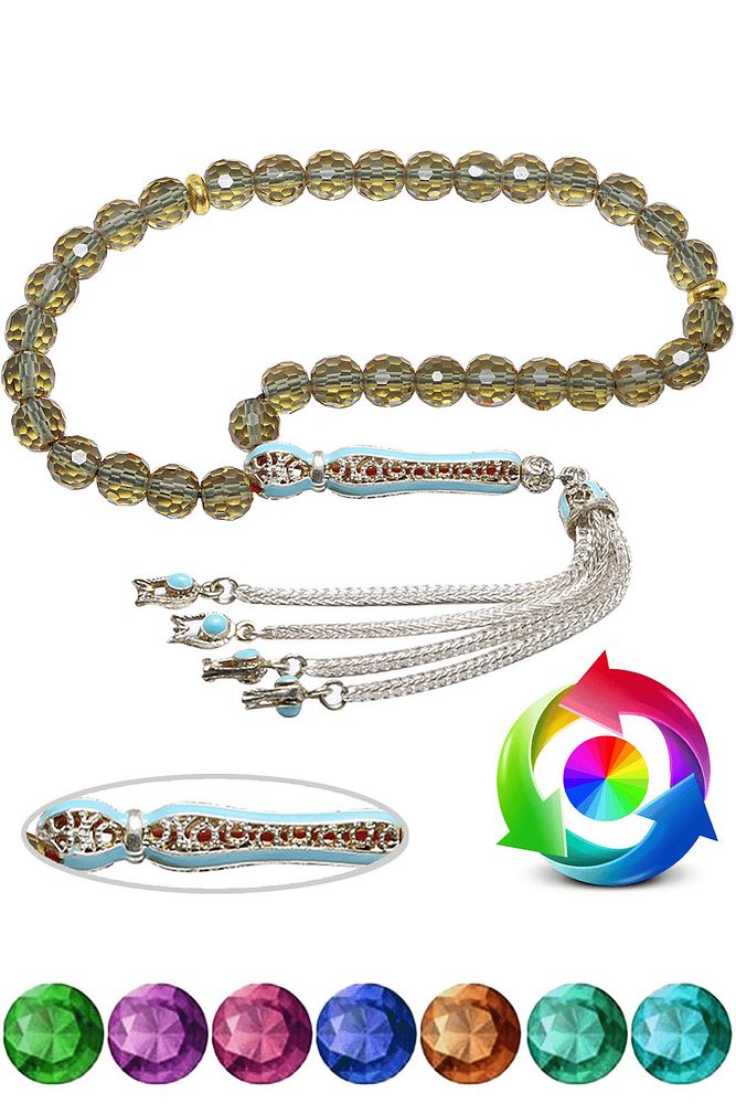 Ürün ya da Doğal Taş Açıklaması (Ortam Işığına Göre 7 Renk Değiştiren Türkiye'nin En Değerli Taşı) Zultanit tesbih modelleri, ''Tesbih Atölyesi'' Atölyelerinde ustalarımız tarafından kuru torna işciliği ile elde özen ile tane tane işlenmektedir. Ürünlerimiz el işciliği olduğu için sınırlı sayıda üretilmektedir. Tasarımlarımızda kullandığımız taşlar Dünya'nın en kaliteli doğal taşlarını ithal etmekteyiz. Tasarımlarımızda kullandığımız doğal taşların hiç biri birbirinin aynısı olmadığı için küçükte olsa farklılık gösterebilir. Doğal taşlar vücudunuza temas ettiği anda negatif enerjinizi alır ve pozitif enerjiler verir. Bu tasarımda; Muğla Milas'tan çıkan Türkiye'nin en değerli ''Ortam ışığına göre 7 renk değiştiren'' zultanit taşı ve beyaz altın kaplama turkuaz mineli telkari imame ve püskül seti kullanılmıştır. Çift kaplama rodaj sistemi uygulandığı için renk atmaz ve kararmaz bir yapıya sahiptir. Üretildiği Taş; Zultanit (Sultanite); Ana Renk; Doğal Renk; Ağırlık; 20 gr; Tane Şekli; 7x7 mm; Tane Ölçüsü; Küre Kesim; Toplam Uzunluk; 20-30 cm; İmame ve Püskül Maddesi; Düşük Ayar Gümüş;