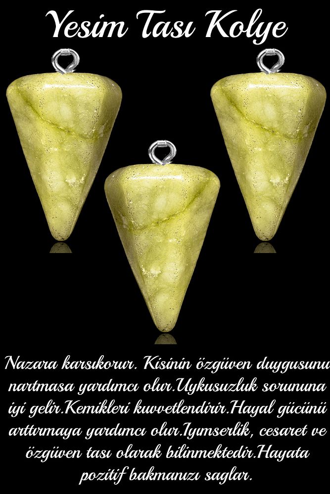 Bu doğal taş kolye tasarımımızda; Yeşim taşı kolye kullanılmıştır. Zincir ölçüsü 45 cm'dir. Her için uyumludur. Yetişkin ve çocuk için kullanılabilir. %100 Orijinal ve gerçek taştır. inizi stresinizi alacak, mineral açısından oldukça zengin olduğu için bulunduğu için teniniz ile temas eder etmez aradaki farkı kısa bir süre içinde hissedeceksiniz.