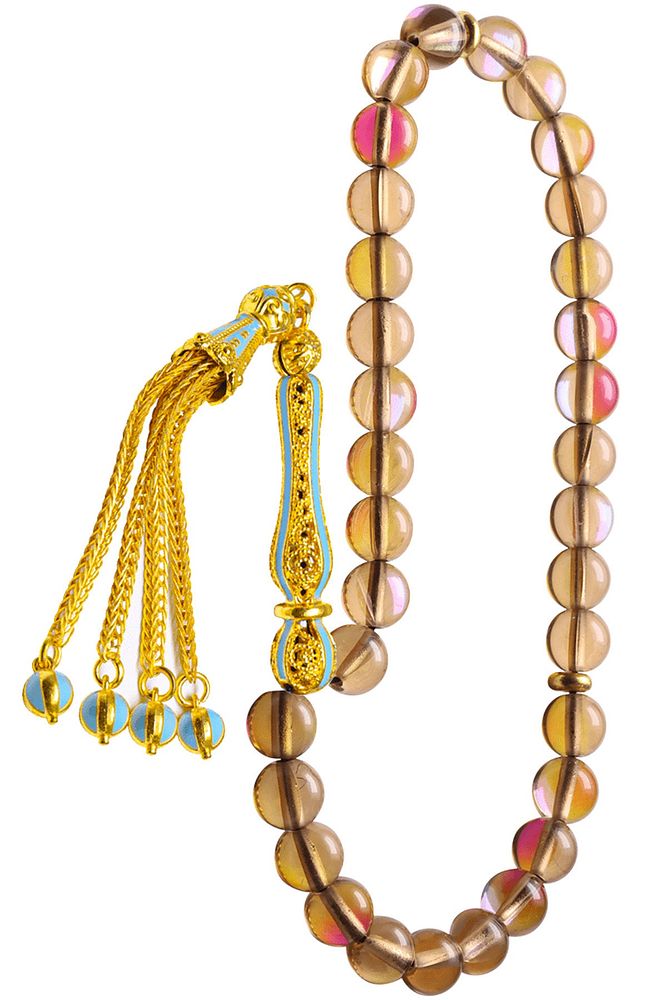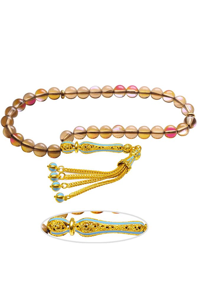 Ürün ya da Doğal Taş Açıklaması (Para - Sağlık - Pozitif Enerji Taşı) Kuvars tesbih modelleri, ''Tesbih Atölyesi'' Atölyelerinde ustalarımız tarafından kuru torna işciliği ile elde özen ile tane tane işlenmektedir. Ürünlerimiz el işciliği olduğu için sınırlı sayıda üretilmektedir. Tasarımlarımızda kullandığımız taşlar Dünya'nın en kaliteli doğal taşlarını kullanmaktayız. Tasarımlarımızda kullandığımız doğal taşların hiç biri birbirinin aynısı olmadığı için küçükte olsa farklılık gösterebilir. Doğal taşlar vücudunuza temas ettiği anda negatif enerjilerinizi alır ve pozitif enerjiler verir. Bu tasarımda; Dumanlı doğal kuvars taşı ve Sarı turkuaz mineli 24 ayar altın kaplama imame ve püskül seti kullanılmıştır. Çift kaplama atıldığı için renk atmaz ve kararmaz bir yapıya sahiptir. Yedek ip ile gönderim sağlanır. Üretildiği Taş; Kuvars; Ana Renk; Doğal Renk; Ağırlık; 20-30 gr; Tane Şekli; 8x8 mm; Tane Ölçüsü; Küre Kesim; Toplam Uzunluk; 20-30 cm; İmame ve Püskül Maddesi; Düşük Ayar Gümüş;