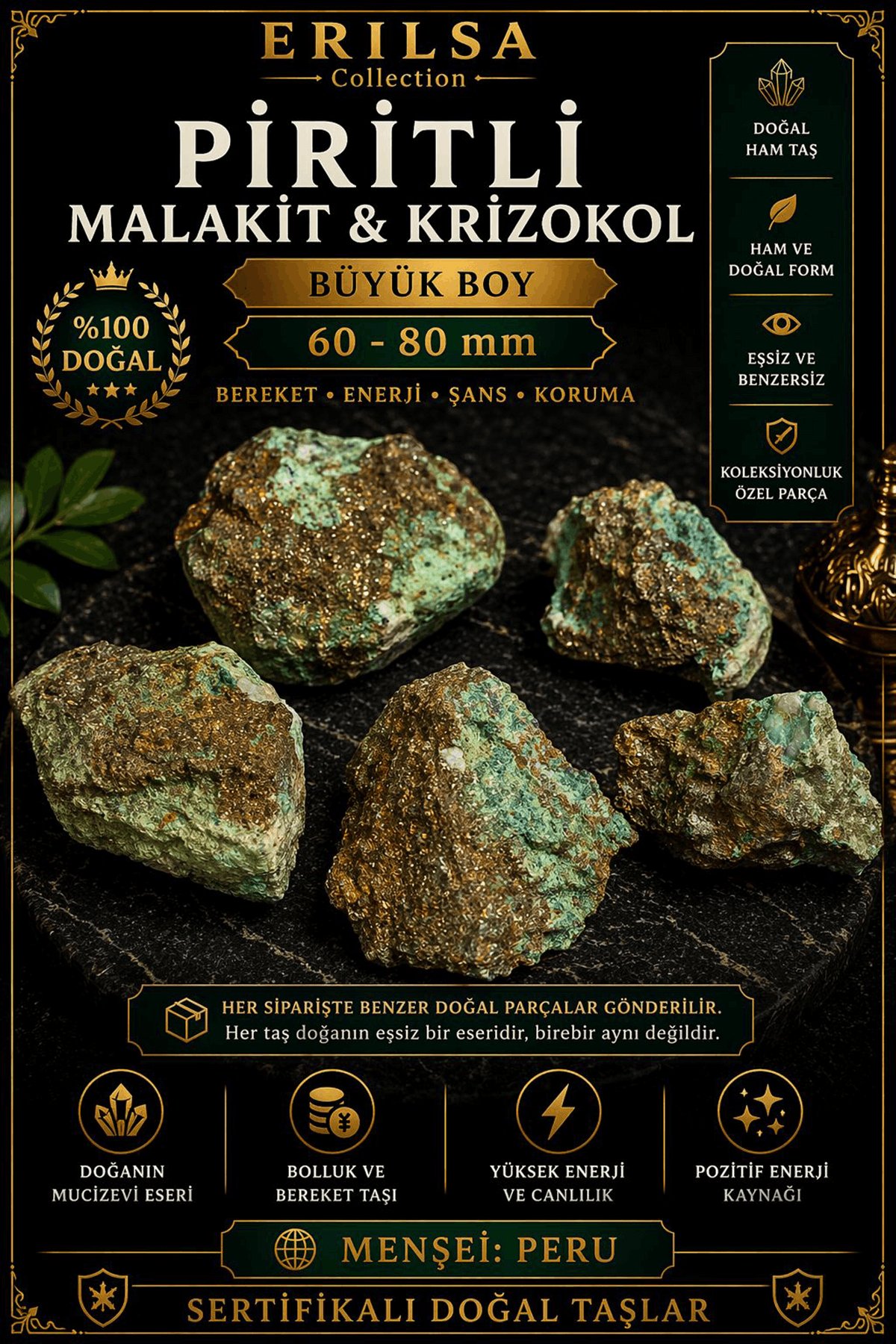 60-80 mm ölçülerindeki büyük boy piritli malakit ve krizokol taşları, güçlü formu ve yoğun mineral yapısı ile koleksiyonluk ürünler arasında üst segmentte yer alır. Büyük yüzey alanı sayesinde taşın doğal damarları, renk geçişleri ve piritin metalik yansımaları çok daha net şekilde gözlemlenir