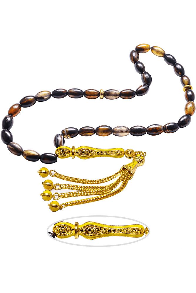 Sertifikalı Sarı Altın Kaplama Püsküllü Doğal Siyah Akik Taşı Tesbih