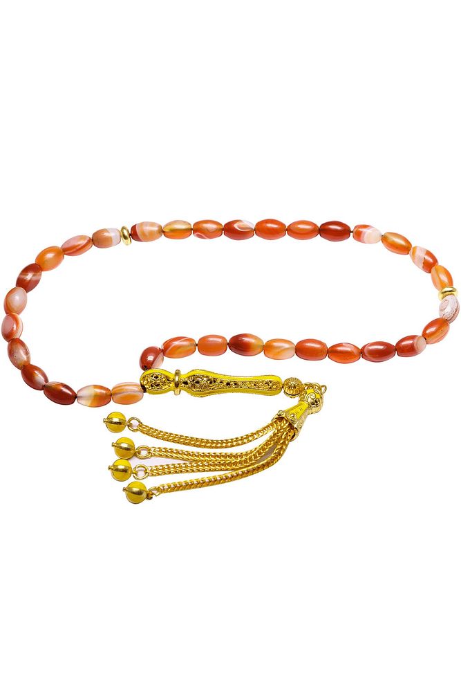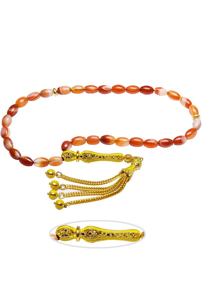 Ürün ya da Doğal Taş Açıklaması (Para, Bereket ve Pozitif Enerji Taşı) Akik tesbih modelleri, ''Tesbih Atölyesi'' Atölyelerinde ustalarımız tarafından kuru torna işciliği ile elde özen ile tane tane işlenmektedir. Ürünlerimiz el işciliği olduğu için sınırlı sayıda üretilmektedir. Tasarımlarımızda kullandığımız taşlar Dünya'nın en kaliteli akik taşlarını kullanmaktayız. Tasarımlarımızda kullandığımız doğal taşların hiç biri birbirinin aynısı olmadığı için küçükte olsa farklılık gösterebilir. Vücudunuza temas ettiği anda negatif enerjilerinizi alır ve pozitif enerjiler verir. Yedek ipi gönderilir ve ürünlerimiz ''Tesbih Atölyesi'' koruyucu ağaç kutusu ile gönderilmektedir. Bu tasarımın yapımında; Doğal turuncu akik taşı kullanılmıştır. İmame ve püskül tasarımında; Sarı mineli altın kaplama telkari imame ve püskül seti kullanılmıştır. Çift kaplama atıldığı için renk atmaz ve kararmaz bir yapıya sahiptir. Üretildiği Taş; Akik Taşı; Ana Renk; Doğal Renk; Ağırlık; 20-30 gr; Tane Şekli; 6x9 mm; Tane Ölçüsü; Beyzi Kesim; Toplam Uzunluk; 20-30 cm; İmame ve Püskül Maddesi; Düşük Ayar Gümüş;