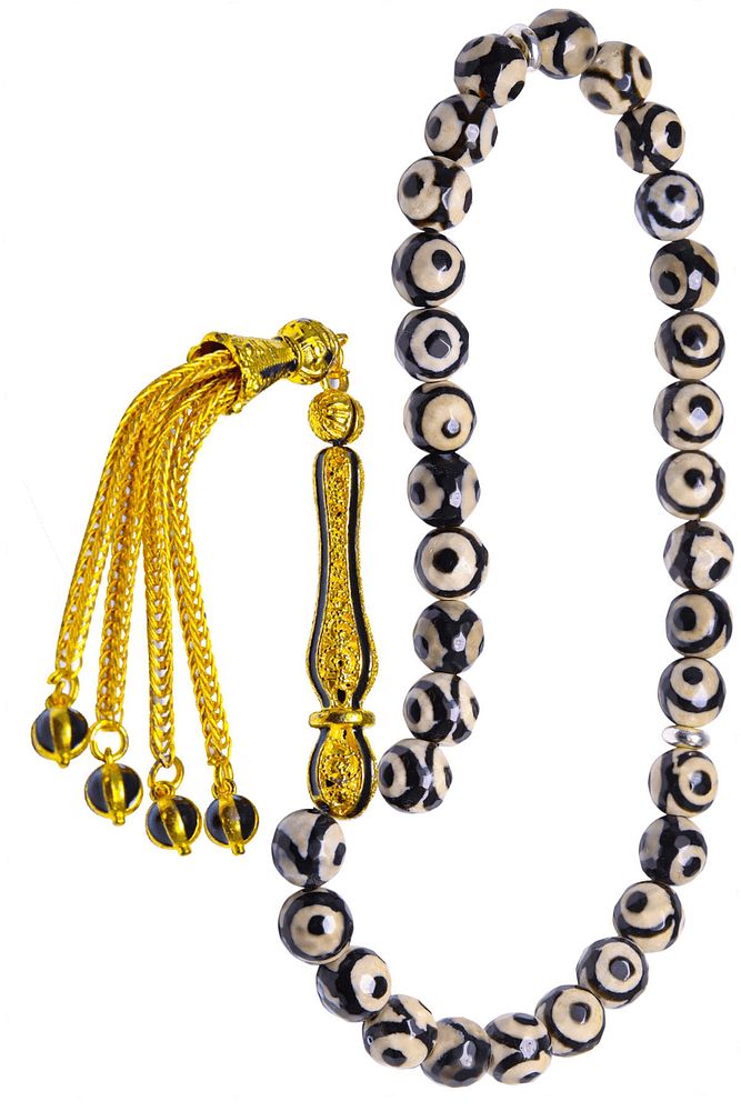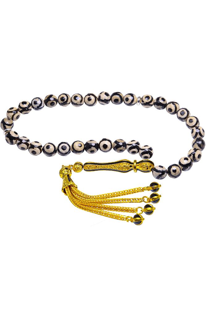 Ürün ya da Doğal Taş Açıklaması (Para, Bereket ve Pozitif Enerji Taşı) Akik tesbih modelleri, ''Tesbih Atölyesi'' Atölyelerinde ustalarımız tarafından kuru torna işciliği ile elde özen ile tane tane işlenmektedir. Ürünlerimiz el işciliği olduğu için sınırlı sayıda üretilmektedir. Tasarımlarımızda kullandığımız taşlar Dünya'nın en kaliteli akik taşlarını kullanmaktayız. Tasarımlarımızda kullandığımız doğal taşların hiç biri birbirinin aynısı olmadığı için küçükte olsa farklılık gösterebilir. Vücudunuza temas ettiği anda negatif enerjilerinizi alır ve pozitif enerjiler verir. Yedek ipi gönderilir ve ürünlerimiz ''Tesbih Atölyesi'' koruyucu ağaç kutusu ile gönderilmektedir. Bu tasarımda; Siyah benekli doğal tibet akik taşı ve altın kaplama siyah mineli telkari imame ve püskül seti kullanılmıştır. Çift kaplama atılıdığı için renk atmaz ve kararmaz bir yapıya sahiptir. Üretildiği Taş; Akik Taşı; Ana Renk; Doğal Renk; Ağırlık; 20-30 gr; Tane Şekli; 8x8 mm; Tane Ölçüsü; Küre Kesim; Toplam Uzunluk; 20-30cm; İmame ve Püskül Maddesi; Düşük Ayar Gümüş;