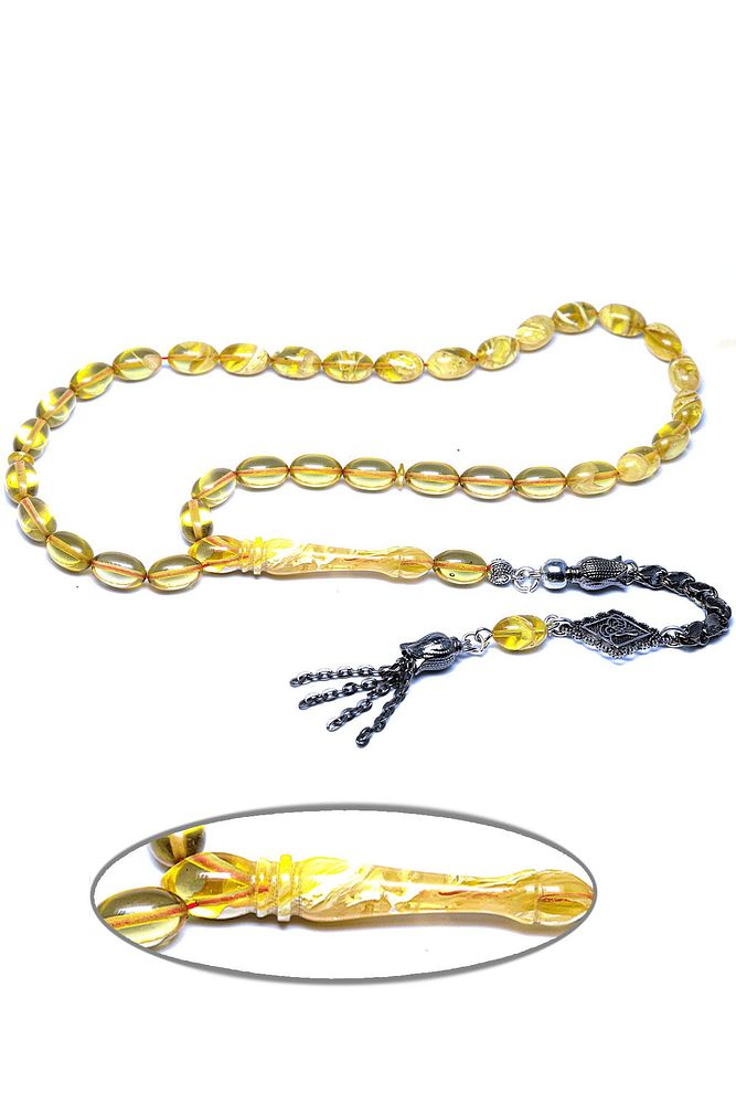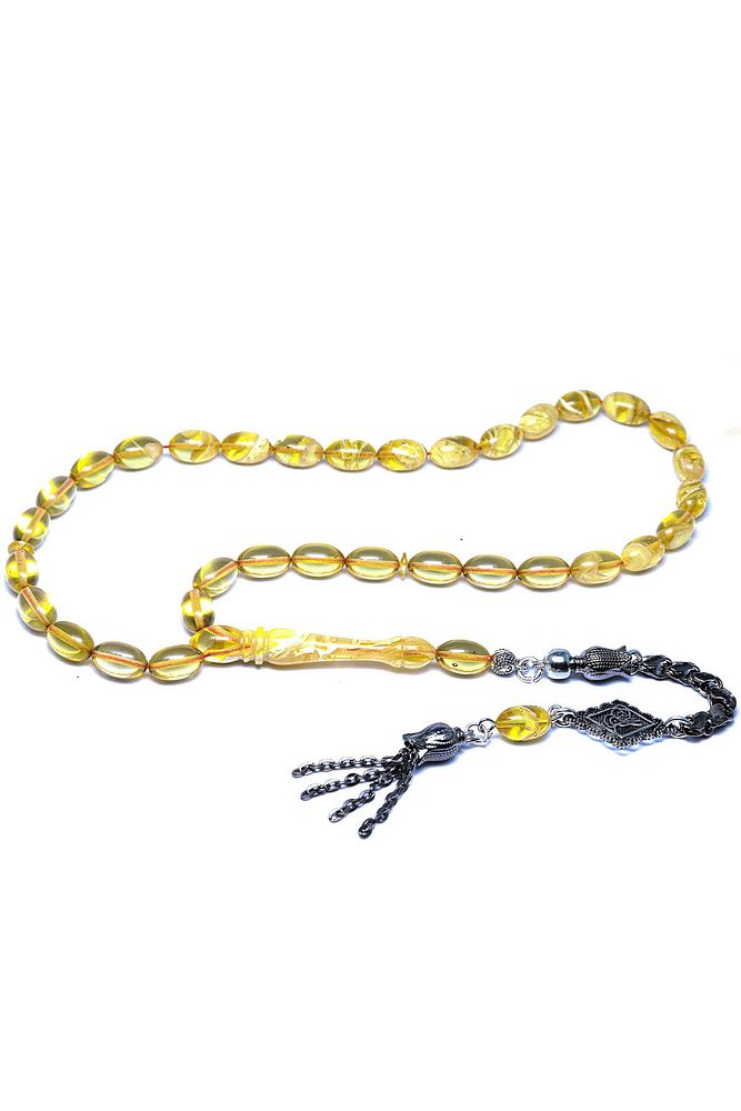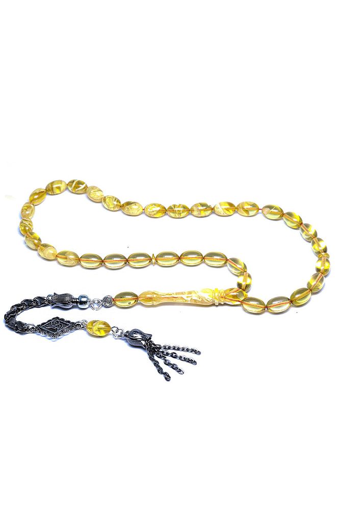 Ürün ya da Doğal Taş Açıklaması; ; (Baş Ağrısı Sinir ve Stres); ; Tesbih Atölyesi, Sıkma kehribar tesbih, tasarımları özel olarak usta ellerde tasarlanır. Tasarımlarımız el yapımı olup sınırlı adette üretilmektedir. Tasarımlarda kullanılan püsküller düşük ayar gümüşten imal edilir. Tasarımlarda kullanılan kehribar taneleri hareli özel kalıplardan yapılır. Yapay reçine ile üretilmektedir. Ürünlerimiz renk almakta ve koku vermektedirler. ; ; Bu tasarımda; Yoğun sarı şeffaf renk hüzmesi 1.kalite sıkma kehribar reçine kullanılmıştır. Her kehribar tanesi birbirinin aynısı olmadığı için küçükte olsa farklılıklar gösterebilir.; ; Üretildiği Malzeme; Sıkma Kehribar; Ana Renk; Sarı Renk; Ağırlık; 20-30 gr; Tane Şekli; 7x11 mm; Tane Ölçüsü; Beyzi Kesim; Toplam Uzunluk; 20-30 cm; İmame ve Püskül Maddesi; Düşük Ayar Gümüş;