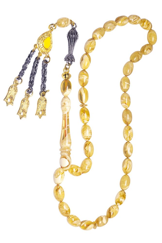 Sertifikalı Sarı Renkli Beyzi Kesim Hareli Sıkma Kehribar Tesbih