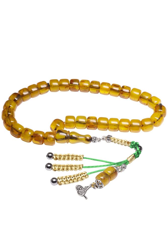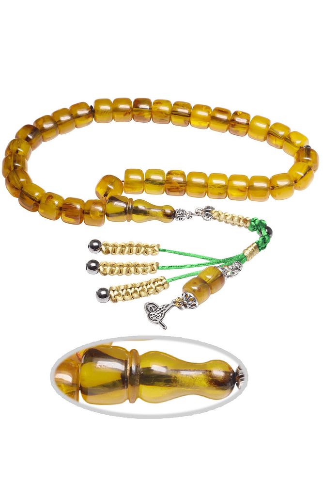 Sertifikalı Sarı Renkli Fıçı Kesim Yeşil Sıkma Kehribar Tesbih