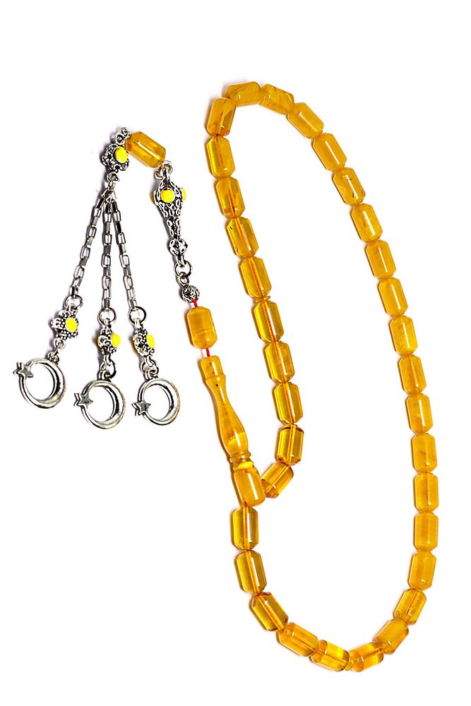 Sertifikalı Sarı Renkli Halep Püsküllü Sıkma Kehribar Tesbih
